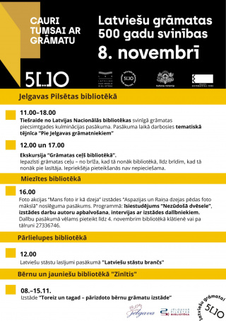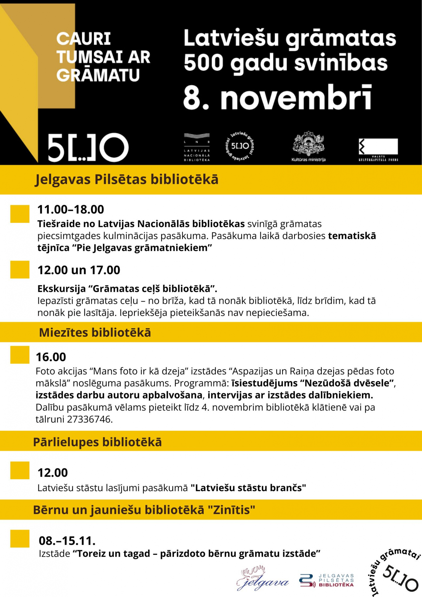 Tiešraide no Latvijas Nacionālās bibliotēkas svinīgā grāmatas piecsimtgades kulminācijas pasākuma “Cauri tumsai ar grāmatu”.Pasākuma laikā darbosies tematiskā tējnīca “Pie Jelgavas grāmatniekiem”. Apmeklētājiem būs iespēja vērot tiešraidi, baudīt tasi tējas un šai dienai īpaši sagatavotu ēdienkarti “Jelgavas literātu gaumē”. Lai gan tā nebūs īsta maltīte, “ēdienkarte” būs radoši pielāgota svētku tematikai