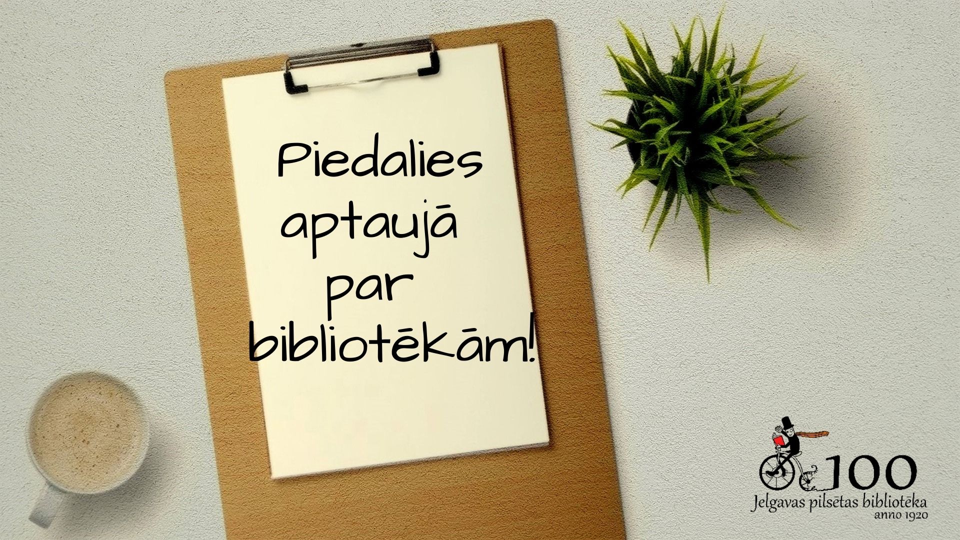 Jelgavas pilsētas bibliotēka aicina pilsētas iedzīvotājus izteikt savu viedokli par bibliotēkas darbu, nozīmi un nepieciešamajiem uzlabojumiem, piedaloties aptaujā. Īpaši aicinām aizpildīt anketu arī tos, kas ikdienā bibliotēku neapmeklē.Aptaujā respondenti aicināti sniegt atbildes par saviem bibliotēkas apmeklēšanas paradumiem, bibliotēkas pakalpojumiem un citiem ar bibliotēkas darbu saistītiem jautājumiem, kā arī izteikt savus ierosinājumus. Jāuzsver, ka aptaujas mērķis ir uzzināt vairāk par bibliotēkas lietošanas paradumiem ikdienišķos apstākļos, nevis ārkārtējās situācijas laikā, tāpēc aicinām izteikt savu viedokli par bibliotēku darbu kopumā, nevis konkrēti par pandēmijas laika periodu.