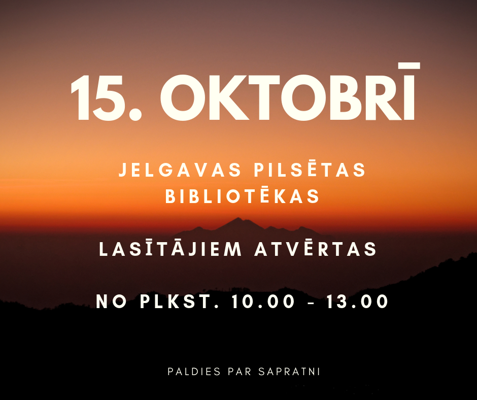 Jelgavas pilsētas bibliotēkā, Pārlielupes bibliotēkā, Miezītes bibliotēkā un bērnu bibliotēkā Zinītis 15. oktobrī lasītājus apkalposim no plkst. 10.00 līdz plkst. 13.00. Paldies par sapratni!