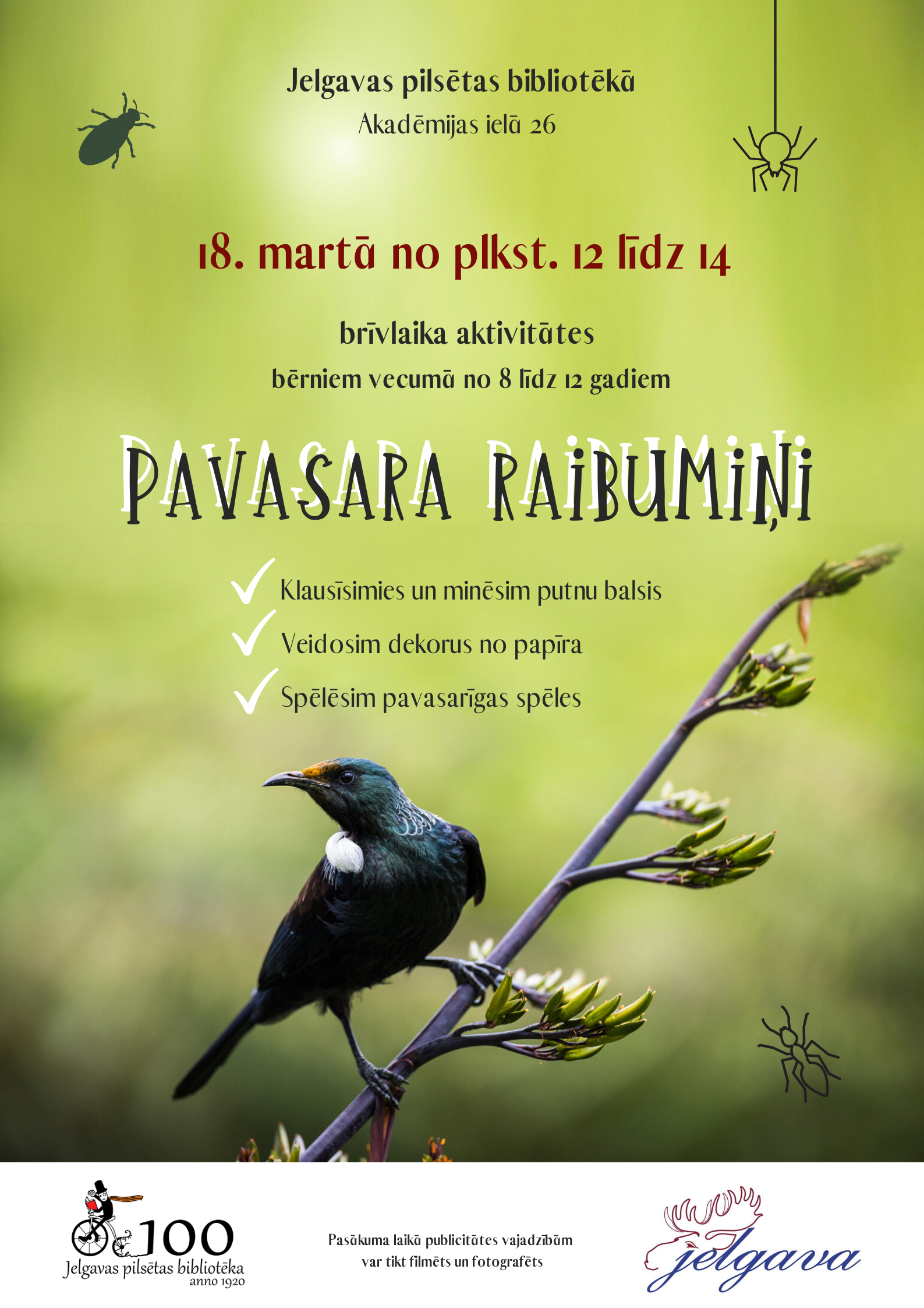 Nākamnedēļ skolās ir pavasara brīvlaiks. Un kā jau ierasts, Jelgavas pilsētas bibliotēka skolēnu brīvlaikā aicina bērnus vecumā no 8 līdz 12 gadiem saturīgi pavadīt laiku bibliotēkā.Agri atnākušais pavasaris tā vien aicina uz izkustēšanos, uz jautrībām un nebēdnībām. Un tā šoreiz Raibumiņi tiks veltīti mūsu mazajiem spārnotajiem pavasara vēstnešiem - putniem. Klausīsimies un mēģināsim atminēt viņu balsis, kā arī radoši izpaudīsimies, veidojot pavasarīgus dekorus no papīra. Un, protams, kā jau ierasts - arī mazliet izkustēsimies! Pasākums ir bez maksas un nav arī iepriekš jāpiesakās. Vienkārši nāc un ņem līdzi savu māsu, brāli, skolas biedru vai kaimiņu!