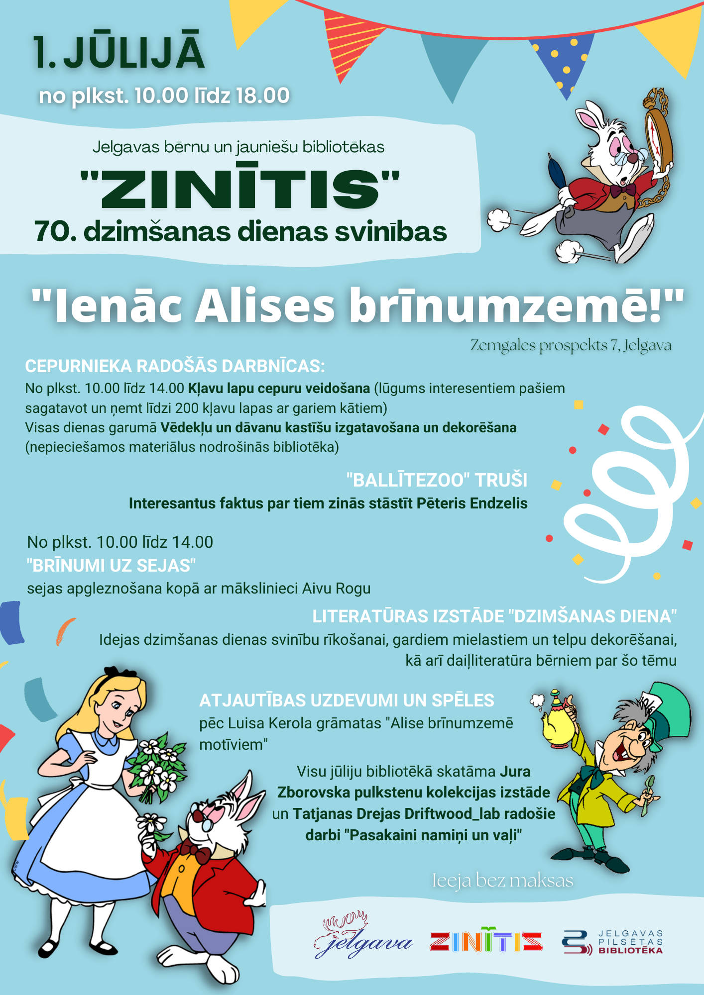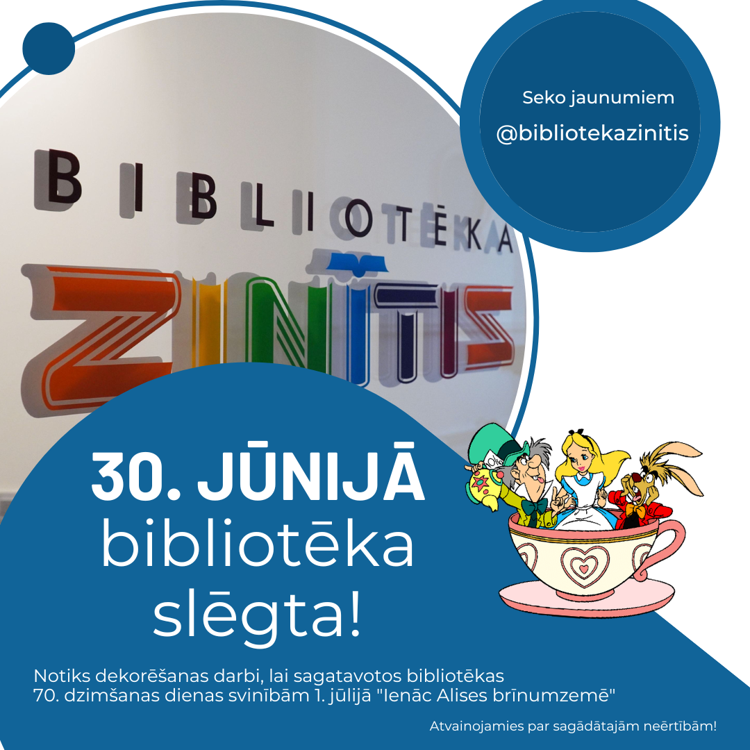 30. jūnijā Jelgavas bēnu un jauniešu bibliotēka “Zinītis” (Zemgales prospekts 7) apmeklētājiem slēgta. Notiks dekorēšanas darbi, lai sagatavotos bibliotēkas 70. dzimšanas dienas svinībām 1. jūlijā “Ienāc Alises brīnumzemē”.