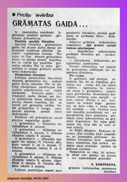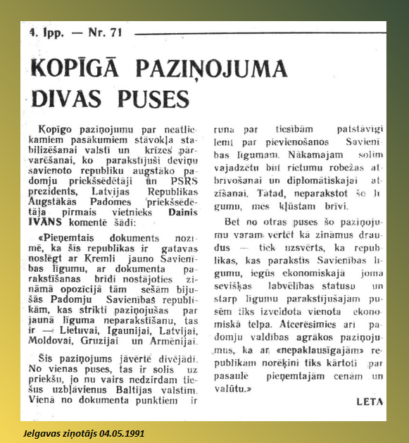 Šogad 1990. gada 4. maija notikumu atcerei tiek veltīti virtuāli sarīkojumi, ir pieejami dažādi interesanti un vērtīgi materiāli (2) par šīs dienas notikumiem pirms 30 gadiem. Taču līdzās svētkiem, sarkanbaltsarkanajiem karogiem un baltiem galdautiem noris arī ikdienas dzīve – tā, par ko neraksta avīžu pirmajās lapās, ko nerāda TV ziņu sižetu pirmajās minūtēs. Tāpēc Jelgavas pilsētas bibliotēka piedāvā nelielu ieskatu – mozaīku no tā, ko drukāja Jelgavas laikraksti 4. maija 4. lappusē no 1990. gada līdz 2002. gadam – laikā, kad 4. maijs vēl nebija oficiāla brīvdiena un avīzes tika izdotas arī šajā dienā.