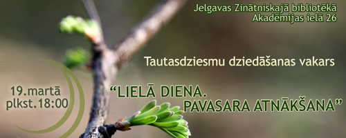 Trešdien, 19.martā, plkst.18:00 Jelgavas Zinātniskā bibliotēka aicina uz kārtējo tautasdziesmu dziedāšanas vakaru „Lielā diena. Pavasara atnākšana". Lielās dienas nozīmi šodien mēs varam izprast, ieklausoties senajās gudrībās, dziedot tautasdziesmas un meklējot atbildes ticējumos.