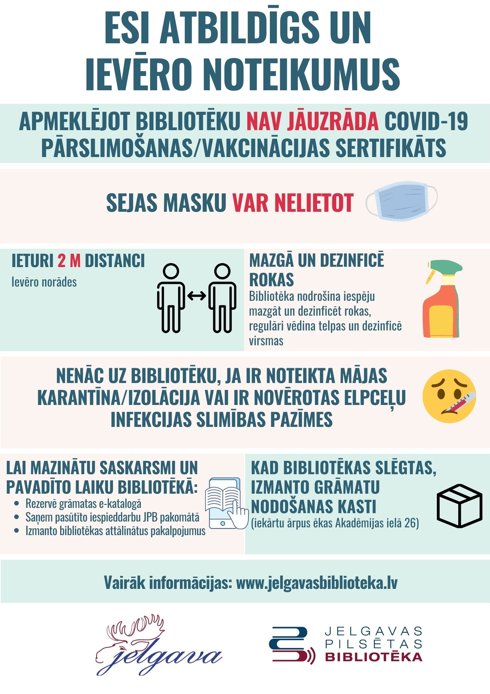 Apmeklētājiem, ierodoties bibliotēkā, nav jāuzrāda sadarbspējīgs Covid-19 vakcinācijas vai pārslimošanas sertifikāts. Bibliotēku iekštelpās ne darbiniekiem, ne apmeklētājiem vairs nav jālieto sejas maskas.