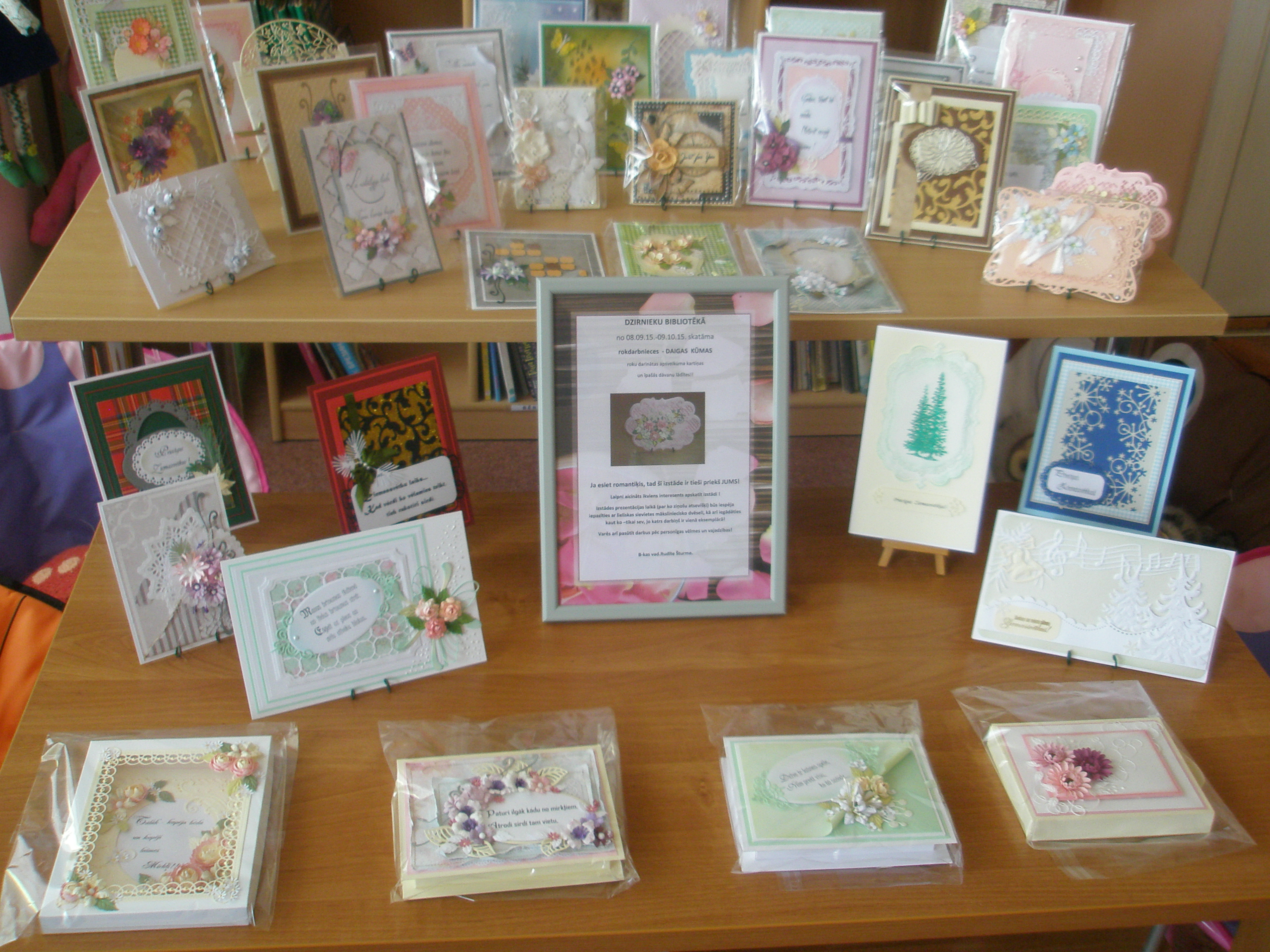 Līdz 9.oktobrim Dzirnieku bibliotēkā skatāma rokdarbnieces Daigas Kūmas roku darinātas apsveikuma kartiņas un īpašas dāvanu lādītes. Ja esiet romantiķis, tad šī izstāde ir tieši priekš jums. Laipni aicināts ikviens interesents!