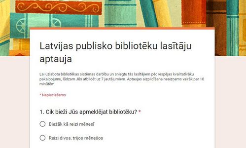 Lai uzlabotu bibliotēkas sistēmas darbību un sniegtu tās lasītājiem pēc iespējas kvalitatīvāku pakalpojumu, lūdzam Jūs atbildēt uz 7 jautājumiem. Aptaujas aizpildīšana neaizņems vairāk par 10 minūtēm.Mums ir svarīgs Jūsu viedoklis. Paldies!