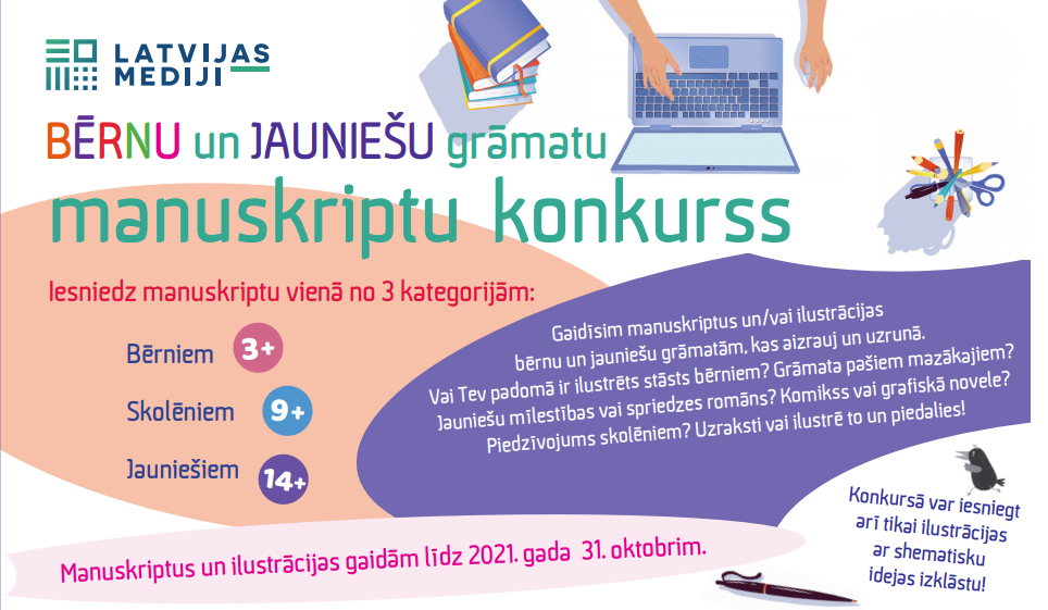 Izdevniecība "Latvijas Mediji" izsludina bērnu un jauniešu grāmatu manuskriptu konkursu. Tā ietvaros gaidīti gan pieredzējušu, gan iepriekš neizdotu autoru darbi, kā arī grāmatu ilustrācijas visdažādākajos žanros. Veidosim un papildināsim, iespējams, nozīmīgāko – bērnu un jauniešu – grāmatu sektoru kopā!Manuskriptiem izvirzītas trīs plašākas vecuma kategorijas: bērniem (3+), skolēniem (9+) un jauniešiem (14+), kurās autori var brīvi darboties. Konkursā autora žanru un grāmatu formātu izvēles nav ierobežotas. Iespējams iesniegt arī ilustratora ideju bērnu grāmatai, uzrādot shematisku idejas izklāstu un ilustrāciju paraugus.