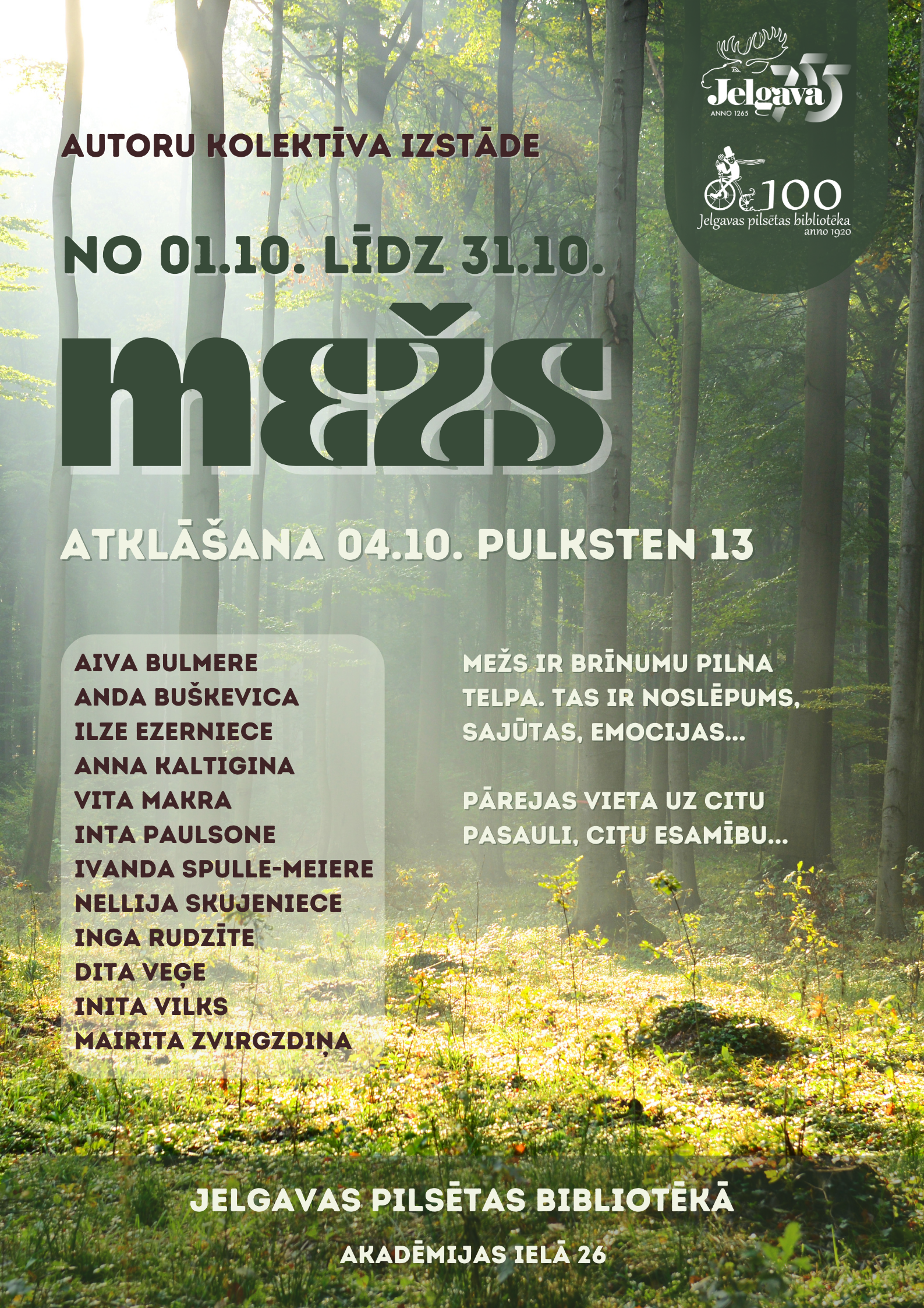 Svētdien, 4. oktobrī, pulksten 13.00 Jelgavas pilsētas bibliotēkas Informācijas centrā, Akadēmijas ielā 26, tiks atklāta 12 autoru kolektīva darbu izstāde "Mežs". Izstādē būs aplūkojamas gleznas un zīmējumi dažādās tehnikās, kā arī miniatūri tekstiliju darbi. Savu veikumu bibliotēkas apmeklētājiem parādīs mākslinieces Aiva Bulmere, Anda Buškevica, Ilze Ezerniece, Anna Kaltigina, Vita Makra, Inta Paulsone, Ivanda Spulle-Meiere, Nellija Skujeniece, Inga Rudzīte, Dita Veģe, Inita Vilks un Mairita Zvirgzdiņa.