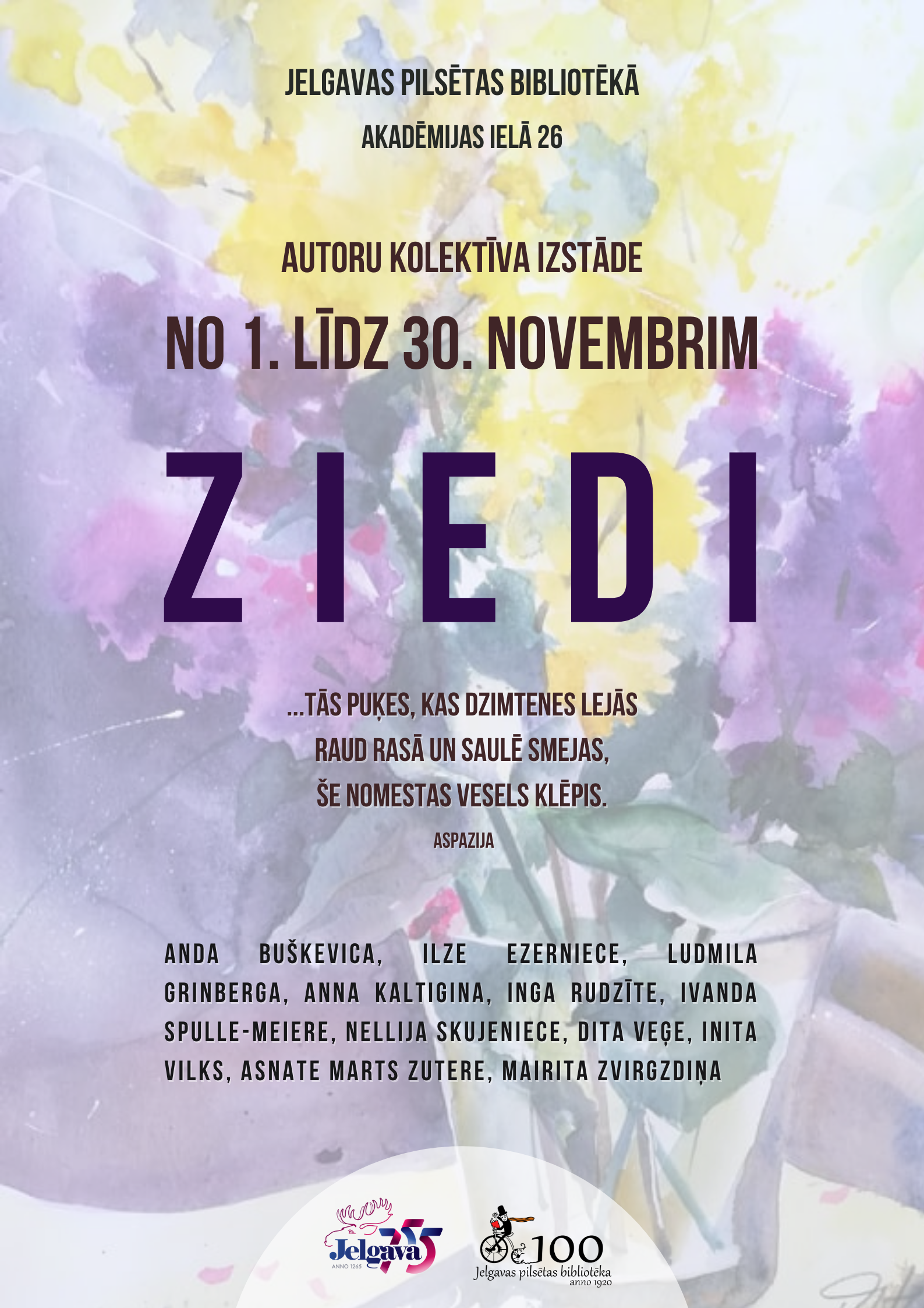 No 1. līdz 30. novembrim Jelgavas pilsētas bibliotēkas Informācijas centrā, Akadēmijas ielā 26, būs redzama autoru kolektīva darbu izstāde “Ziedi”. Lielākā daļa mākslinieču oktobra mēnesī bibliotēkā jau parādīja savu veikumu, apvienojoties izstādē “Mežs”. Novembrī, kad dabā ir vismazāk košu krāsu, autores bibliotēkā ienesīs krāsu prieku caur ziedu krāšņumu.Savus darbus bibliotēkas apmeklētājiem parādīs mākslinieces Anda Buškevica, Ilze Ezerniece, Ludmila Grinberga, Anna Kaltigina, Inga Rudzīte, Ivanda Spulle-Meiere, Nellija Skujeniece, Dita Veģe, Inita Vilks, Asnate Marts Zutere un Mairita Zvirgzdiņa.
