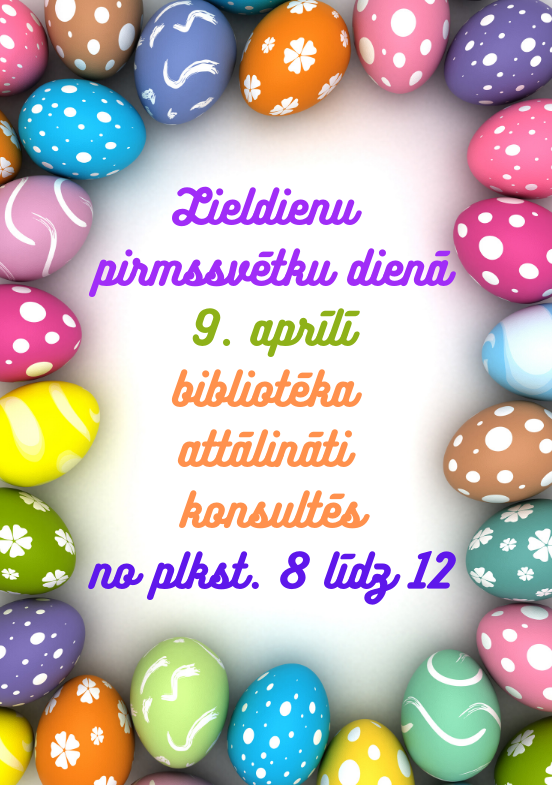 Lieldienu pirmssvētku dienā, 9. aprīlī, Jelgavas pilsētas bibliotēka un tās filiāles lasītājus attālināti apkalpos no plkst. 8 līdz 12. Savukārt svētku laikā no 10. aprīļa līdz 13. aprīlim bibliotēka lasītājus neapkalpos.