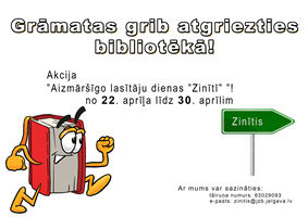No 22.aprīļa bērnu bibliotēkā "Zinītis", tāpat kā visās Latvijas bibliotēkās, tiks atzīmēta Bibliotēku nedēļa, kuras tēma ir "Informēts un vesels". 24.aprīlī pulksten 10:00 bibliotēkas lasītavā visi laipni aicināti uz tikšanos ar zobu higiēnisti Laini Seikstuli, kas sākumskolas vecuma bērniem stāstīs par zobu nomainīšanos, mutes dobuma higiēnu un priekšnoteikumiem, kas jāievēro, lai mutes dobums neradītu problēmas. Lieliska ziņa bibliotēkas parādniekiem, jo Bibliotēku nedēļas ietvaros būs "Aizmāršīgo lasītāju dienas "Zinītī"."No 22.aprīļa līdz 30. aprīlim bibliotēka aicina ikvienu lasītāju pārskatīt grāmatu plauktus un rakstāmgaldus. Ja tajos ir palikusi kāda grāmata, tad šī ir iespēja, kad to atnest uz bibliotēku. Šajā laika periodā netiks iekasēta kavējuma nauda par laikus nenodotiem bibliotēkas iespieddarbiem.