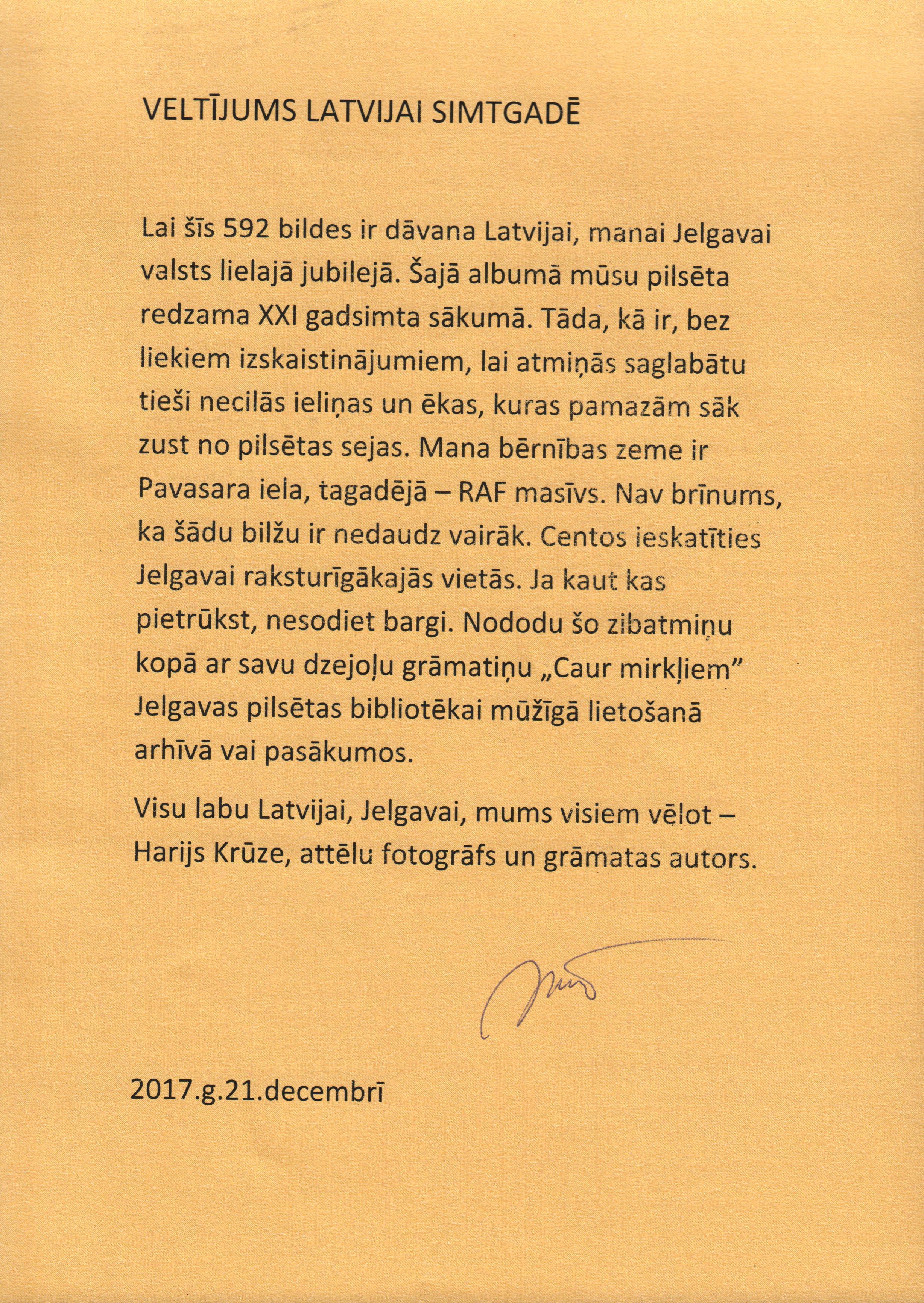 Jelgavas pilsētas bibliotēka gada izskaņā ir saņēmusi nenovērtējamu dāvinājumu – Harija Krūzes fototgrāfijās iemūžinātu 21. gadsimta sākuma Jelgavu.