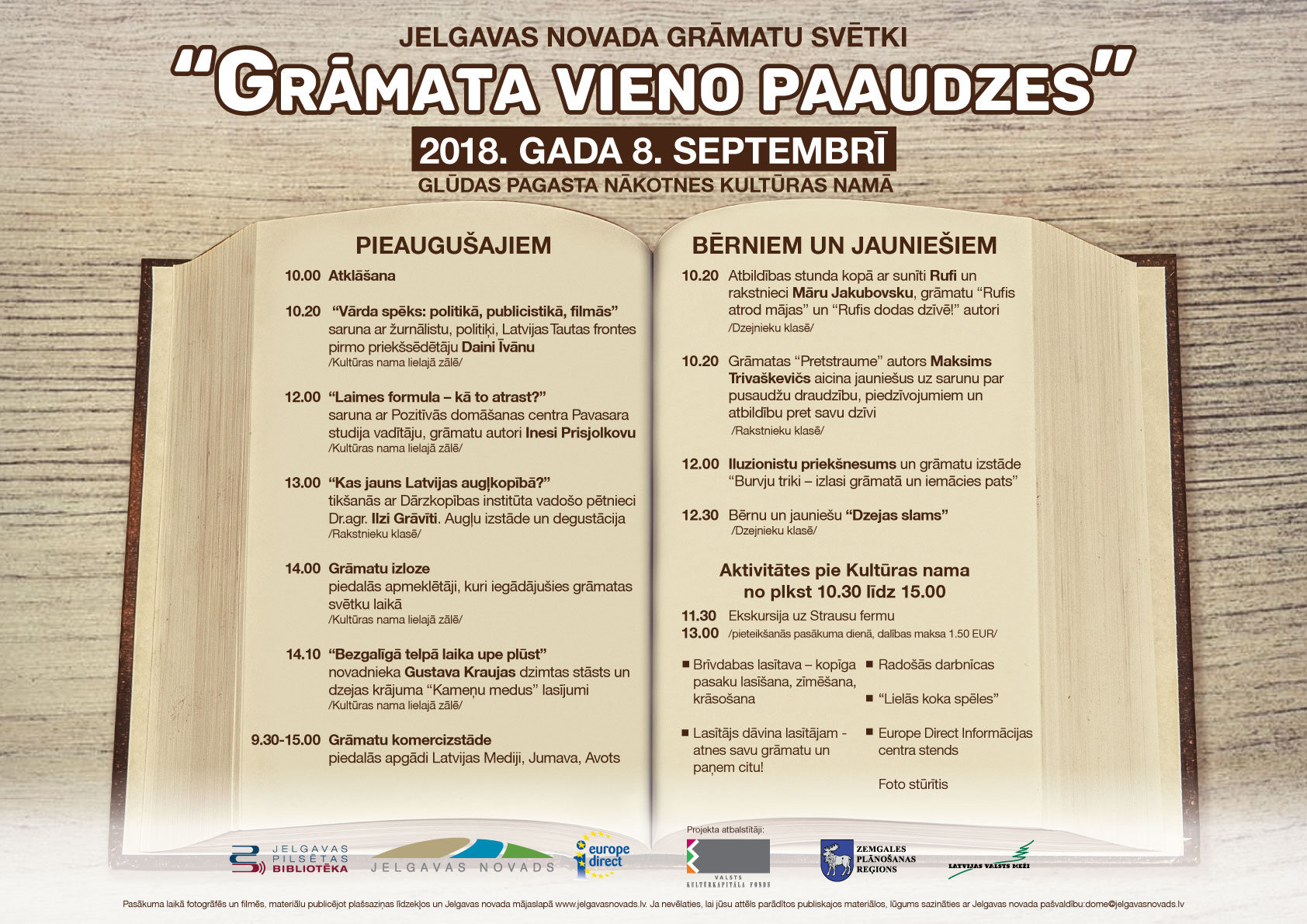 8. septembrī no pulksten 10.00 ikviens aicināts apmeklēt jau tradicionālos Jelgavas novada grāmatu svētkus "Grāmata vieno paaudzes". Šoreiz grāmatu svētki notiks Glūdas pagasta Nākotnes kultūras namā un svētku programma ietver ikvienai paaudzei ko interesantu un īpašu. Laipni aicināts ikviens interesents!