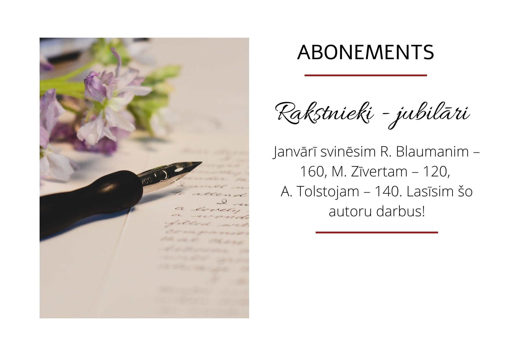 Janvārī atzīmēsim rakstnieku jubilejas, lasīsim detektīvromānus, attīstīsim savu uzņēmēja gēnu un lasīsim, pētīsim citas interesantas tēmas bibliotēkas grāmatu izstādēs.