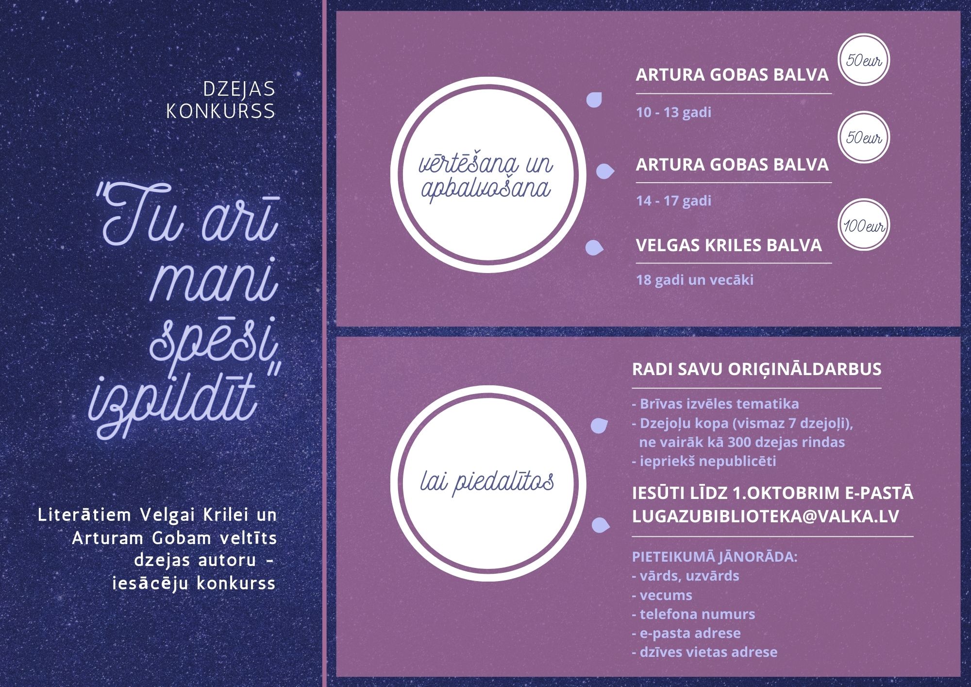 Ar 1. septembri jaunie dzejnieki no visas Latvijas tiek aicināti iesniegt darbus dzejas autoru-iesācēju konkursā “Tu arī mani spēsi izpildīt”. No šī gada ikgadējais Valkas novada dzejas konkurss “Tu arī mani spēsi izpildīt” veltīts diviem nozīmīgiem novada literātiem - Velgai Krilei un Arturam Gobam. Notikušas izmaiņas arī konkursa nolikumā - paplašinātas iespējamo dalībnieku vecuma grupas un papildināts naudas balvu fonds.