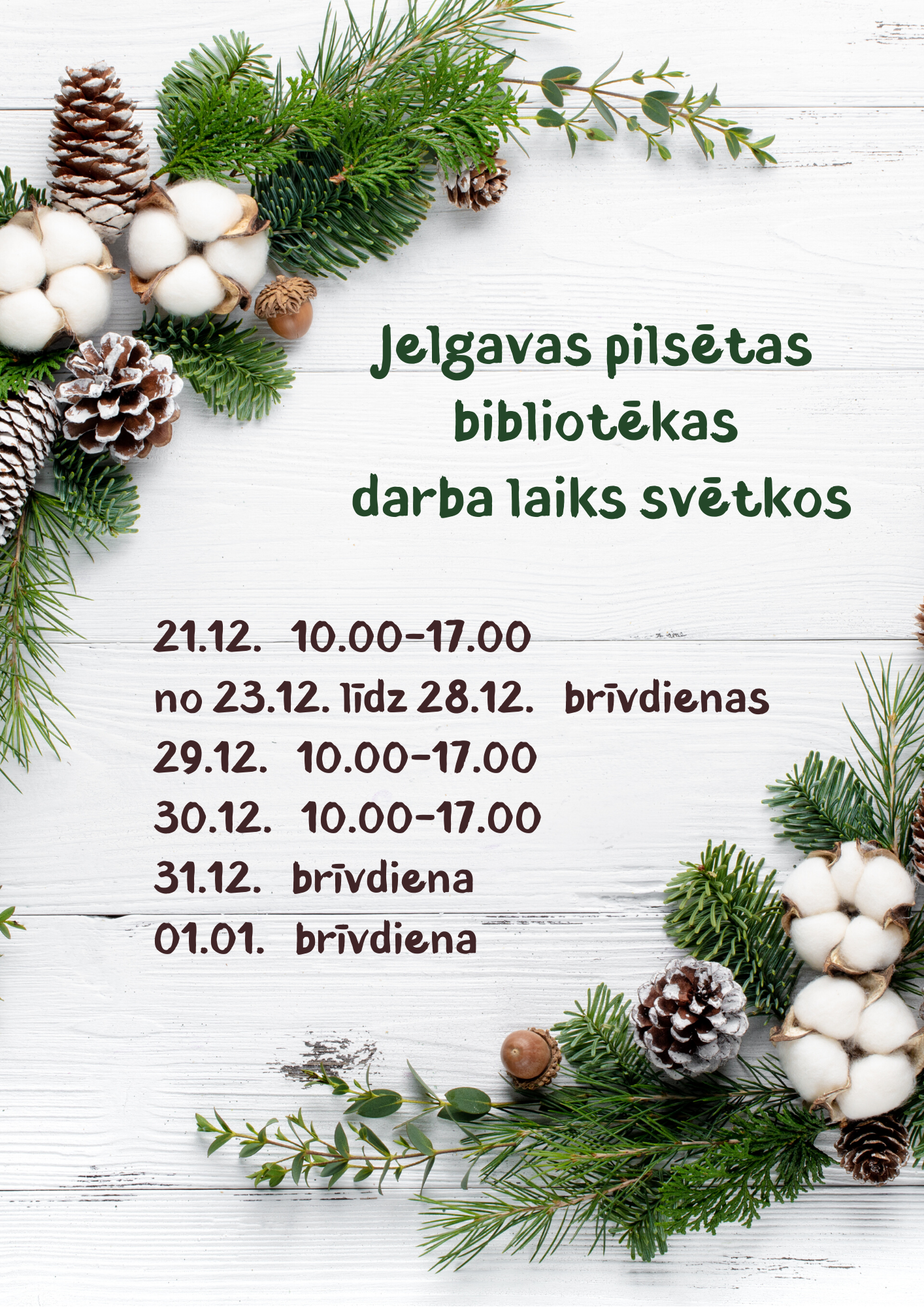 Aicinām pievērst uzmanību Jelgavas pilsētas bibliotēkas darba laika izmaiņām svētku laikā! Lai skaists un gaišs Ziemassvētku un jaunā gada gaidīšanas laiks!