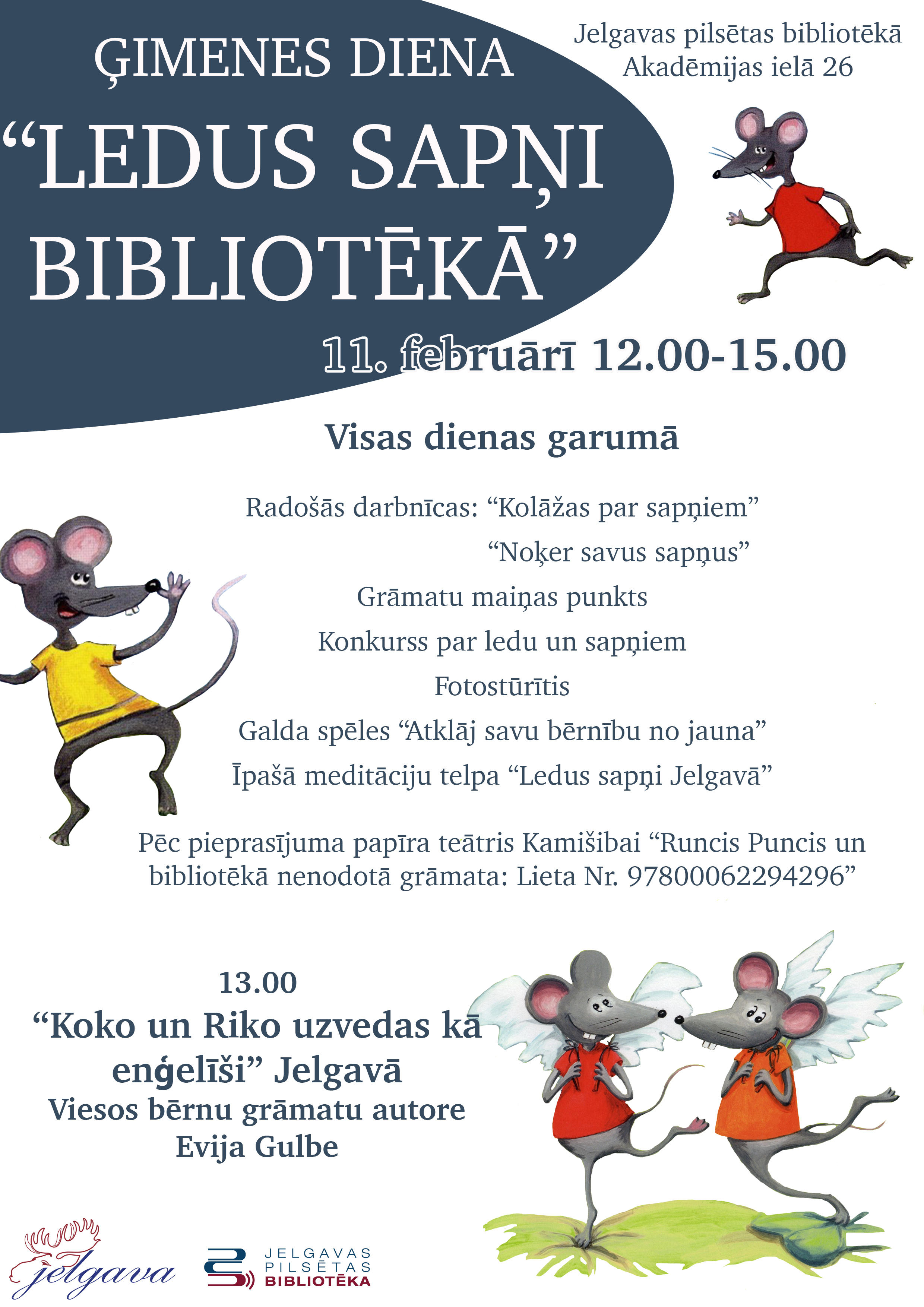 Jelgavas pilsētas bibliotēka 11. februārī aicina uz ģimenes dienu "Ledus sapņi bibliotēkā" – no pulksten 12 līdz 15 bibliotēkā varēs piedalīties radošajās darbnīcās, skatīties attēlu teātra izrādi, apmeklēt īpašo meditācijas telpu, atklāt savu bērnību no jauna, spēlējot galda spēles, piedalīties konkursā un pulksten 13 tikties ar rakstnieci Eviju Gulbi, lai labāk iepazītu Koko un Riko. Laipni aicināts ikviens interesents!