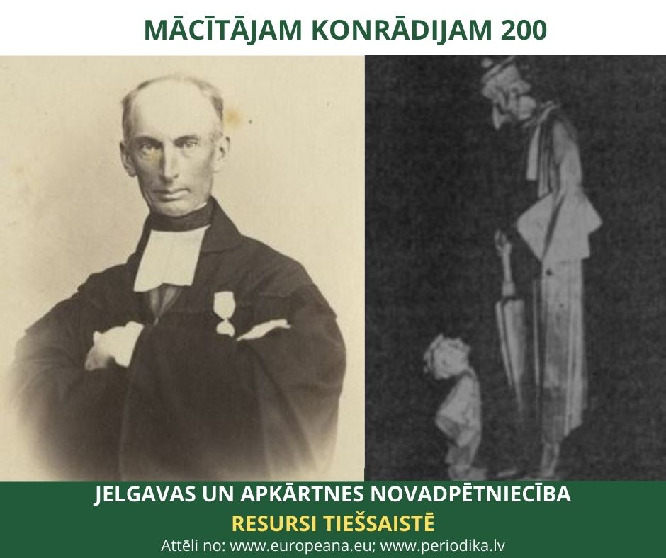 Mācītāju Konrādiju Jelgavā varam dēvēt par leģendāru, sākot jau ar izskatu, jo mācītājs esot bijis tik garš, ka vai garākais cilvēks pilsētā, ar dīvainībām, jo dzīvoja precīzi kā pēc pulksteņa un mīlēja sauli kā ķirzaka, apsauļojās vismaz stundu, kas tajos laikos ļoti neparasti, turpinot ar ilgo kalpošanas laiku, Jelgavas Sv. Annas baznīcā kalpojis 52 gadus. Pa šo pusgadsimtu Konrādijs, vēlāk saukts arī “vecais Kunrādiņš”, iemantojis daudz atzinības, cieņas un sirsnības, tā varam lasīt tā laika avīzēs gan mācītāja 50 gadu darba jubilejas sakarā, gan nekrologos vācu un latviešu presē.