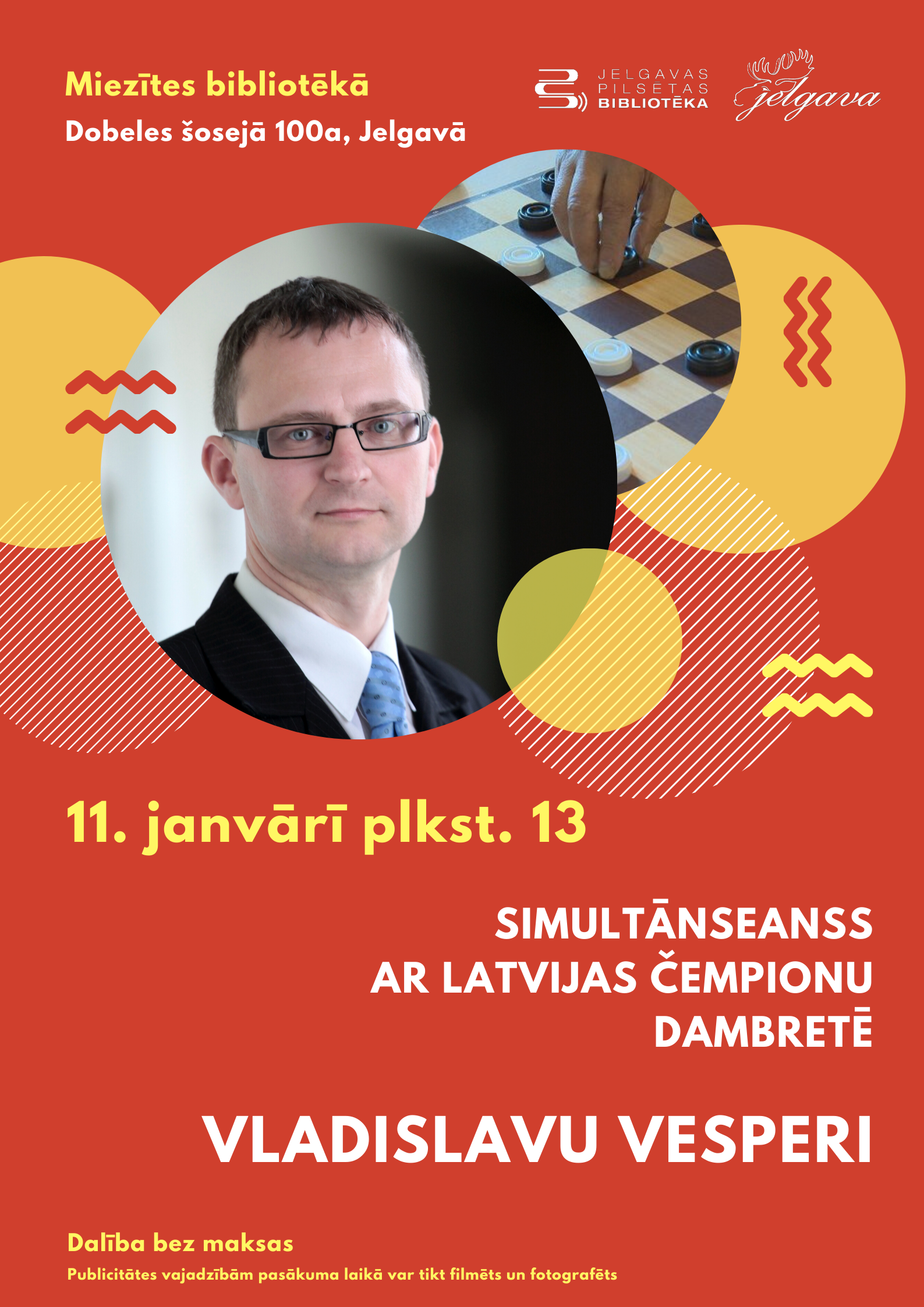 11. janvārī plkst. 13.00 Miezītes bibliotēkā, Dobeles šosejā 100a, notiks simultānseanss ar vairākkārtējo Latvijas čempionu dambretē un pasaules čempionāta turnīra dalībnieku, jelgavnieku Vladislavu Vesperi.Simultānseanss ir sacensība, kurā viens spēlētājs ar baltajiem kauliņiem vienlaikus cīnās pret daudziem oponentiem, secīgi izdarot gājienus viņu galdiņos. Mēroties spēkiem ar vairākkārtējo Latvijas čempionu ir aicināti gan lieli, gan mazi. Ar galdiņiem un kauliņiem visi tiks nodrošināti, dalība ir bez maksas.