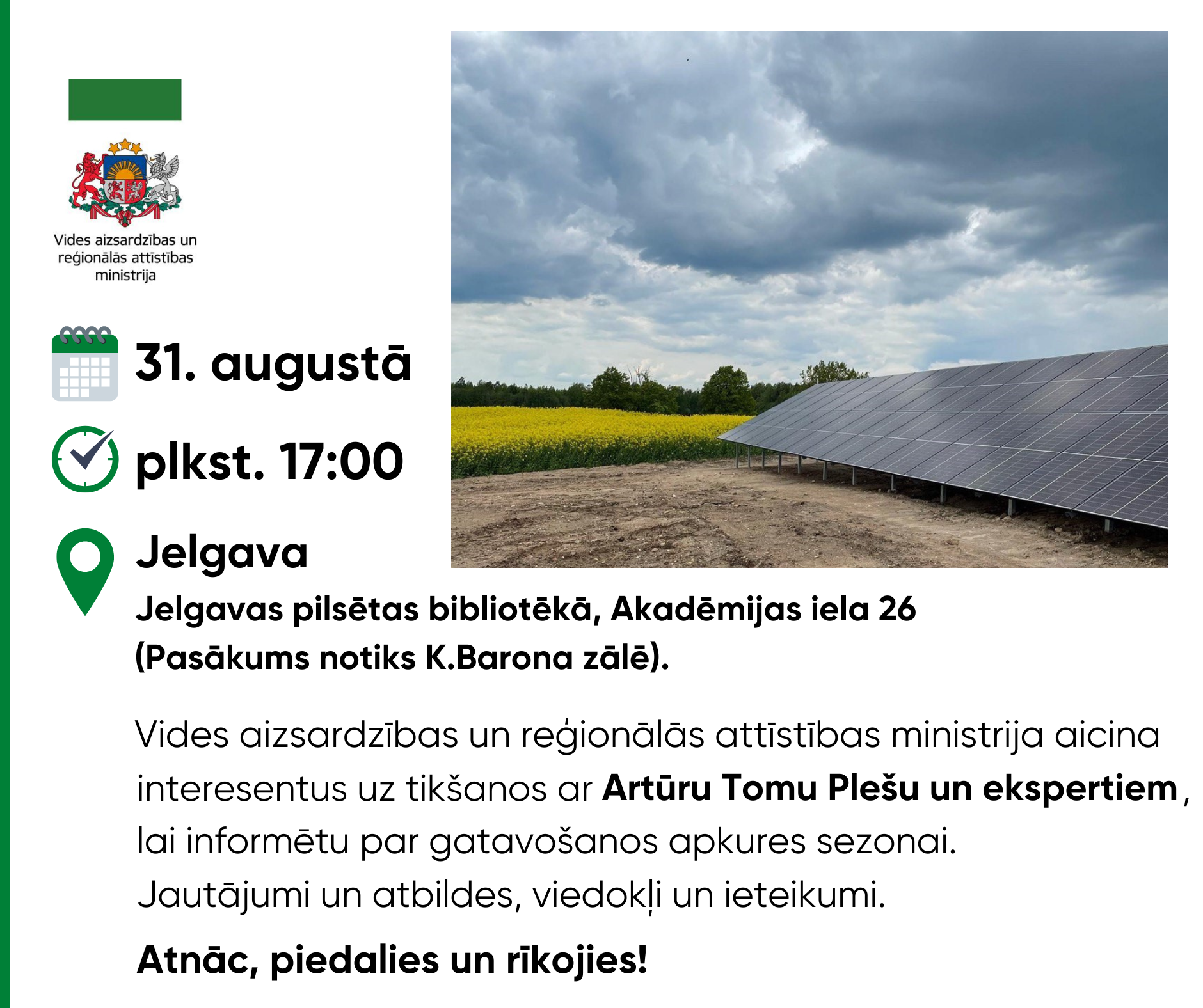 2022. gada 19. augusts, Rīga – Vides aizsardzības un reģionālās attīstības ministrs Artūrs Toms Plešs, turpinot reģionālo vizīšu ciklu, 31. augustā apmeklēs Jelgavas Pilsētas bibliotēku, lai ar iestādes vadību pārrunātu Vides aizsardzības un reģionālās attīstības ministrijas (VARAM) aktualitātes pakalpojumu pieejamības un kvalitātes jomā, tostarp pašvaldību reformas kontekstā. Tāpat paredzēts informēt interesentus par ministrijas izstrādātajām atbalsta programmām iedzīvotājiem fosilā kurināmā nomaiņai mājsaimniecībās, gatavojoties gaidāmajai apkures sezonai. Ministrija sadarbībā ar Latvijas Vides investīciju fonda (LVIF) pārstāvjiem turpina informēt sabiedrību par iedzīvotājiem pieejamajiem atbalsta instrumentiem atjaunojamo energoresursu izmantošanai mājsaimniecībās. Programma paredz atbalstu fosilā kurināmā (piemēram, dabasgāzes, dīzeļdegvielas, akmeņogļu) iekārtu nomaiņai pret jaunām atjaunojamos energoresursus izmantojošām iekārtām (biomasas granulu katli, siltumsūkņi, saules kolektori) vai pieslēgšanos centralizētai siltumapgādes sistēmai, kā arī elektroenerģijas ražošanai no atjaunojamajiem energoresursiem (saules paneļi, vēja ģeneratori) mājsaimniecības pašpatēriņa vajadzībām.