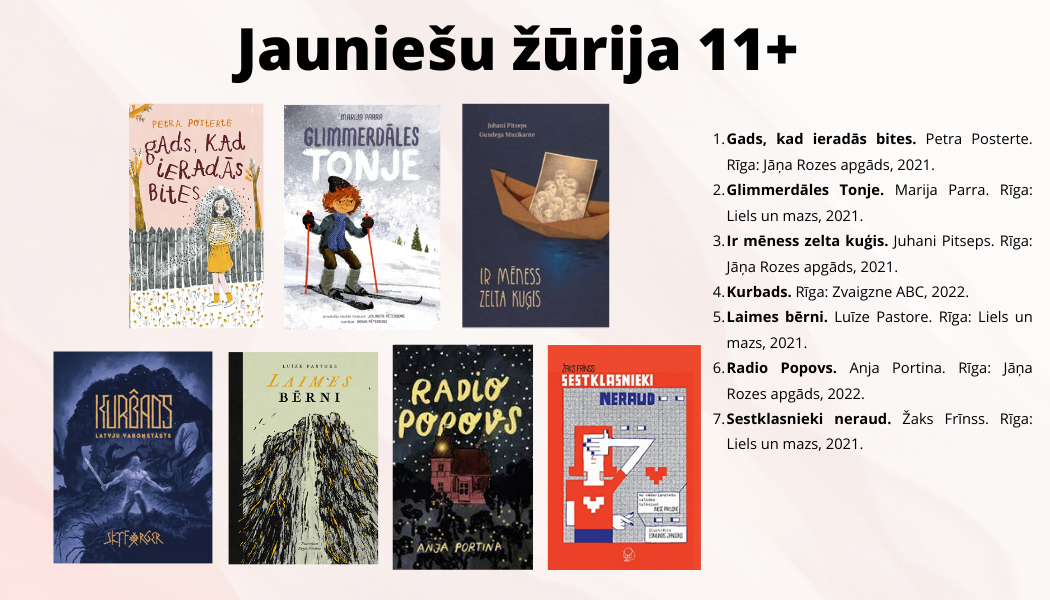 Jelgavas Pilsētas bibliotēka un filiālbibliotēkas aicina mazus un lielus lasītājus pievienoties Bērnu, jauniešu un vecāku žūrijas 2022 lasītāju pulkam. Lasīsim un vērtēsim jaunās žūrijas kolekcijas grāmatas kopā!Latvijas Nacionālās bibliotēkas (LNB) lasīšanas veicināšanas programma “Bērnu, jauniešu un vecāku žūrija” (BJVŽ) piedāvā jaunu, interesantu kolekciju lasīšanai un vērtēšanai. Šī gada grāmatu kolekciju veido 33 grāmatas no 10 izdevniecībām, no tām 15 ir oriģinālliteratūras grāmatas, kuru autori jau sevi pieteikuši kā debiju bērnu literatūrā – Rebeka Lukošus ar stāstu “Nepaklausīgais vectēvs”, Žanete Lazdovska ar savu stāstu par patiesu draudzību, bīstamiem atklājumiem un nervus kutinošām dēkām grāmatā “Neatskaties”, Ilze Skarstiņa ar grāmatu “Lieliskā dzīve bez Zoom”, kurā ikviens lasītājs spēs saskatīt kaut ko no sev ierastām dzīves situācijām. Grāmatu kolekcijā iekļauti arī jau iemīļoti bērnu un jauniešu grāmatu autori – Laura Vinogradova ar sirsnīgu stāstu “Tētis un suns”, Luīze Pastore ar piedzīvojumu stāstu “Laimīgie bērni”, Juris Zvirgzdiņš ar komiksu bērniem “Rijīgā čūska un gudrā pele”, u.c.