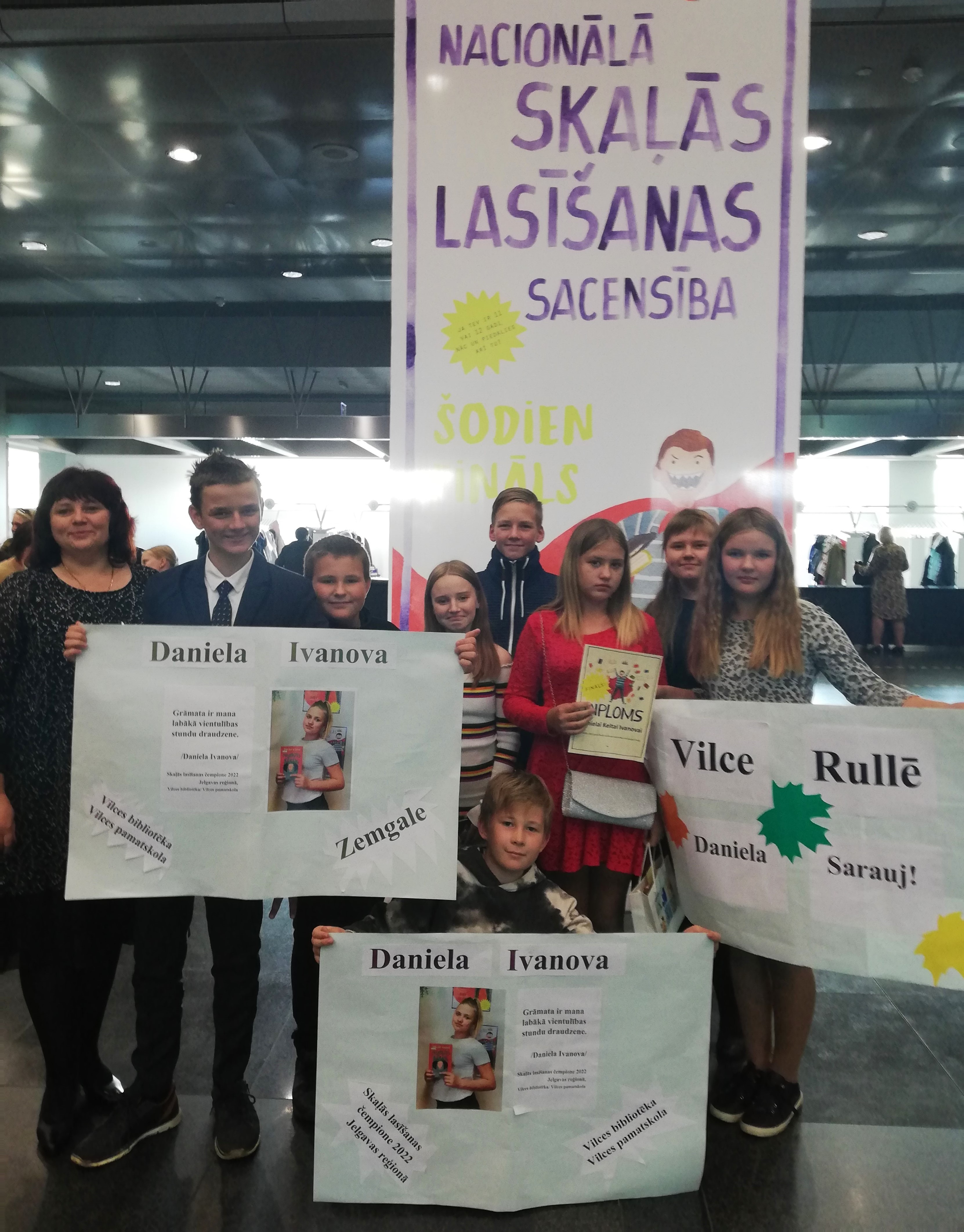 Līdzjutēju komanda (No kreisās: Vilces bibliotēkas vadītāja Regīna Deksne, Vilces pamatskolas 6. klases skolēni – Jēkabs Bleidels, Sandis Kristers Mazurs, Elīza Kaufmane, Daniels Meija, Jelgavas reģiona Skaļās lasīšanas čempione 2022 - Daniela Keita Ivanova, Jelgavas reģiona Skaļās lasīšanas čempione 2021- Katrīna Beroza, Jolanta Cīrule, priekšā- Markuss Emīls Puriņš.)