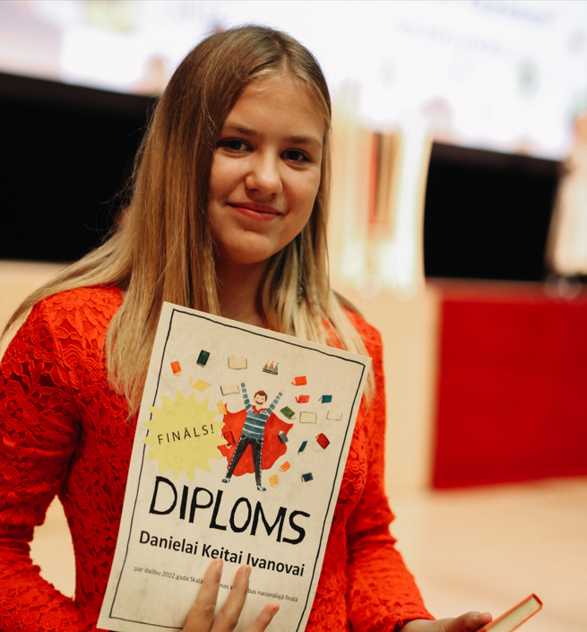 24. septembrī Latvijas Nacionālās bibliotēkas (LNB) Ziedoņa zālē norisinājās Nacionālo skaļās lasīšanas sacensību fināls. Sacensībās piedalījās 30 reģionālie lasīšanas čempioni no visas valsts, viņu vidū 16 meitenes un 14 zēni. Viņus pavadīja klases biedri, kuri skandēja fanu saukļus un demonstrēja atbalsta plakātus.