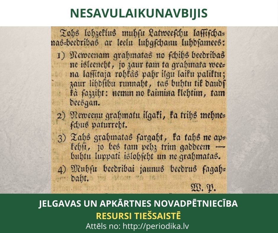 Ievērojamais Jelgavas mācītājs Vilhelms Panteniuss, arī laikraksta “Latviešu Avīzes” redaktors no 1835 līdz 1849 daudz pūlējies latviešu izglītošanās labā. No konservatīvo latviešu frāzes: tas ne savu laiku nav bijis! radījis figurālo lietas vārdu, visa jaunā un progresīvā pretinieku: “Nesavulaikunavbijis”. “Nesavulaikunavbijis” bijis Pantenija mūža ienaidnieks. Cīņā ar to pirms 185 gadiem Jelgavā dibināta “Latviešu lasīšanas biedrība”.“Esam atkal jaunu ēku iecelt uzņēmušies un parādīsim Jums to pamatu. Lieciet savādi, ja ne ģeldē - neesam pretim, bet nedzenat mūs par godakārīgiem. Esam vienu Latviešu lasīšanas - biedrību iecēluši. Katrs loceklis maksā vienu sudr. rubli, un par šo naudu dabon 3 gadus blakām grāmatas lasīt. Latviešu grāmatas dārgas. Visas nevar visi nopirkt. Nevienam, no kā itin nenieka nevarētu savā laikā mācīties. Tālab šķitu labu lietu esam, ja ar maz naudas dabūtu ar visām Latviešu grāmatām iepazīties — un pēc — pirc, kura tev patīk. .. Līdz šim pie mūsu biedrības pieder 30 locekļi. Pēc trim gadiem tās grāmatas izlozēsim, tiem lasīšanas - biedrības locekļiem. Jebkurai grāmatiņai pieliekam pie vāka šos vārdus. Tos locekļus mūsu Latviešu lasīšanas-biedrības ar lielu lūgšanu lūdzamies: