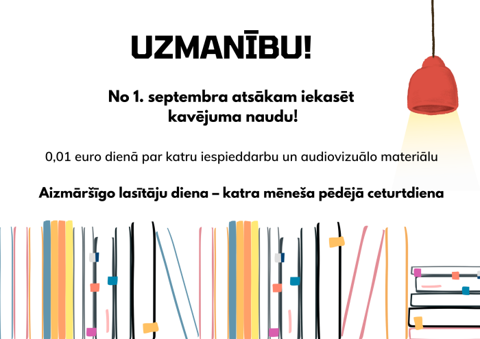 Ja gadījies, ka mājas plauktā aizkavējies kāds bibliotēkas iespieddarbs, tad to var paspēt nodot bez kavējuma naudas līdz pirmajam septembrim.No 1. septembra atsāksim iekasēt kavējuma naudu par laicīgi nenodotiem iespieddarbiem un audiovizuāliem materiāliem – 0.01 eiro dienā par katru iespieddarbu un audiovizuālo materiālu.