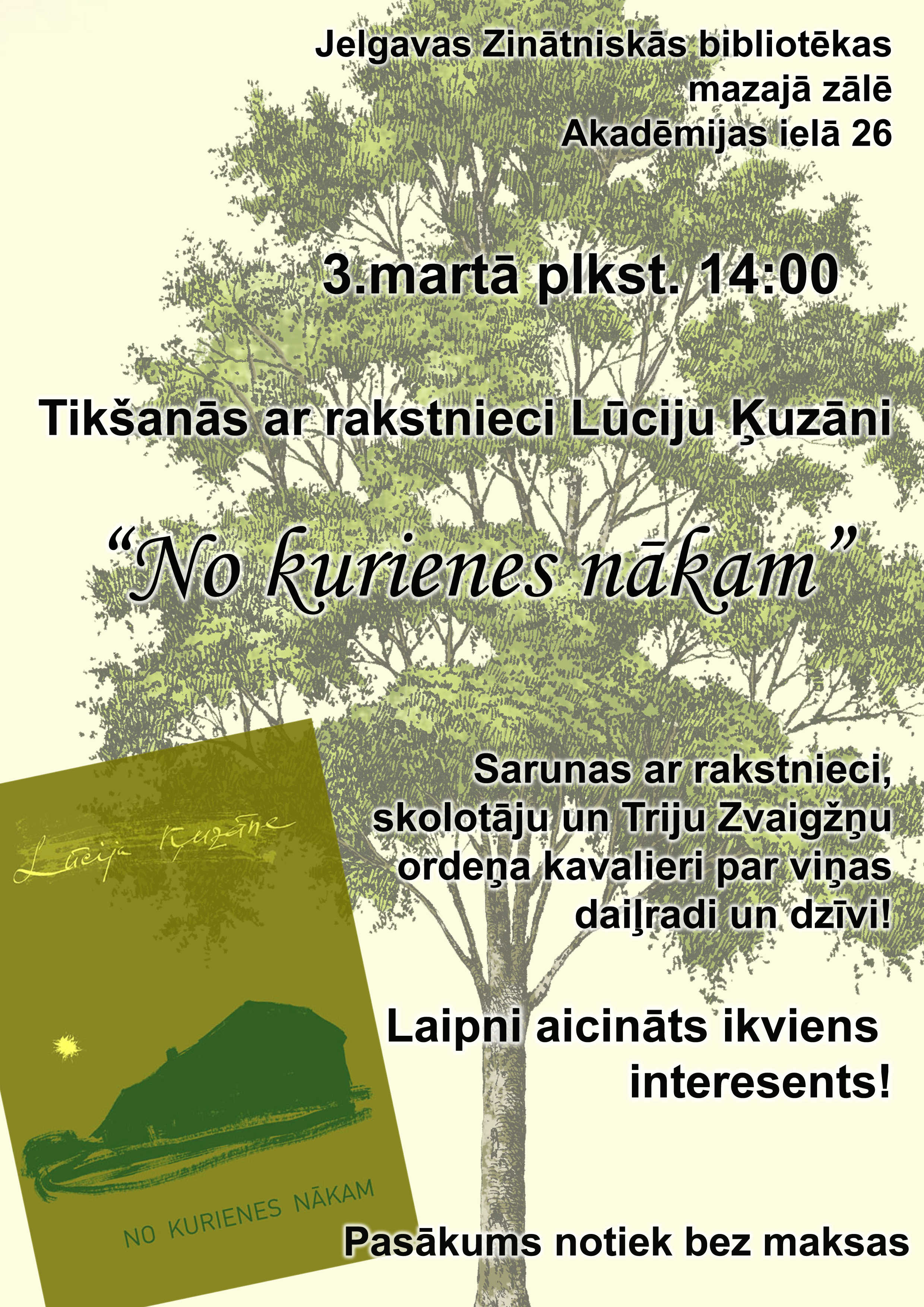 3.martā pulksten 14:00 Jelgavas Zinātniskās bibliotēkas mazajā zālē (310.telpa) aicinām uz sarunu ar rakstnieci, skolotāju un Triju Zvaigžņu ordeņa kavalieri Lūciju Ķuzāni. Uz šo tikšanos laipni aicināts ikviens interesents!