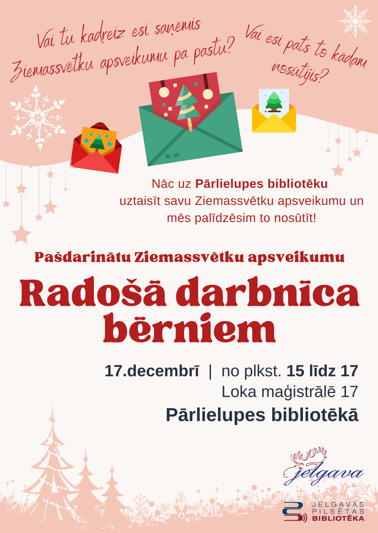 Pārlielupes bibliotēka 17.decembrī no pulksten 15 līdz 17 aicina uz pašdarinātu Ziemassvētku apsveikumu radošo darbnīcu bērniem.