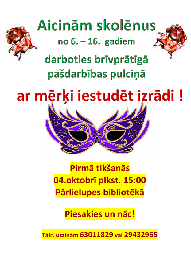 Pārlielupes bibliotēka aicina skolēnus vecumā no 6 līdz 16 gadiem darboties brīvprātīgā pašdarbības pulciņā ar mērķi iestudēt izrādi.