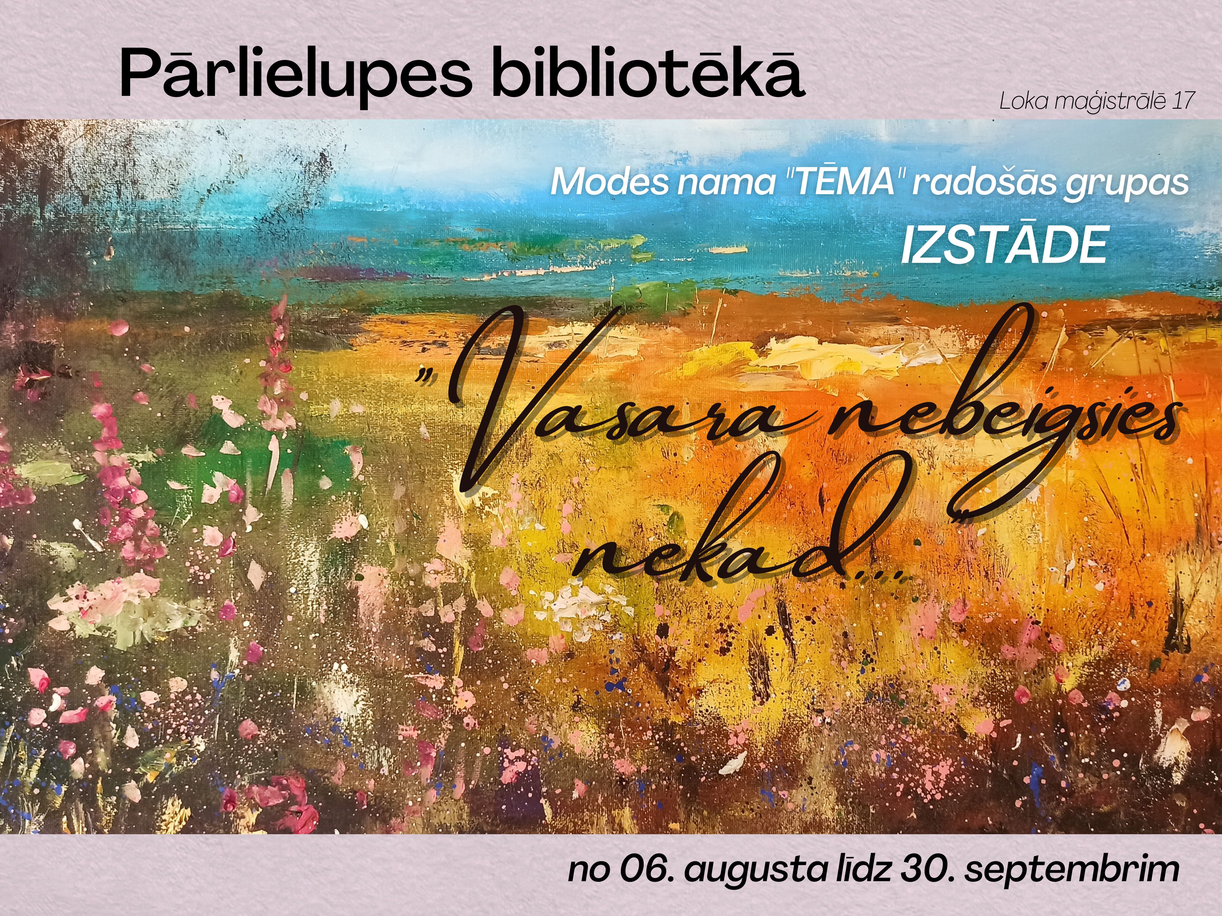 No 6. augusta Pārlielupes bibliotēkā (Loka maģistrālē 17) skatāma Modes nama “Tēma” radošās grupas izstāde “Vasara nebeigsies nekad...” Jau 6 gadus mākslas pedagoģe Inta Paulsone pulcē kopā cilvēkus, kuru īstā aizraušanās ir glezniecība. Šai izstādei Inta Paulsone, Inta Vāne, Dace Skrauple un Zinta Miezaine piedāvā darbus, ko iedvesmojusi Latvijas daba un it īpaši – ziedu krāšņums. “Ar prieku dalāmies mirkļos, kurus esam vēlējušās notvert savās gleznās,” stāsta Inta Paulsone.