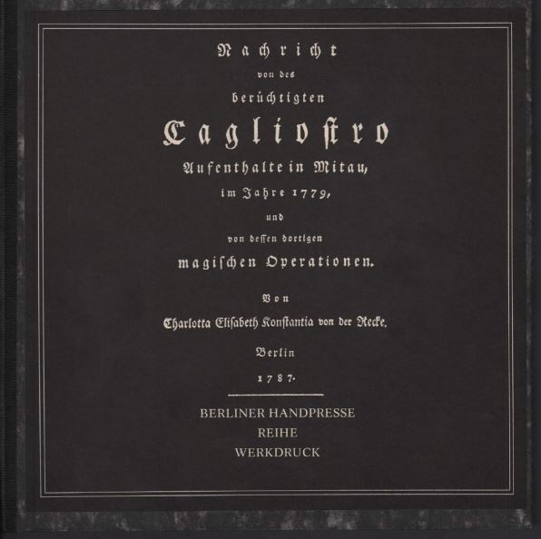 Apraksts katalogā: Nachricht von des beruchtigten Cagliostro Aufenhalte in Mitau, im Jahre 1779 un von dessen dortigen magischen Operationen von Sharlotta Elisabeth Konstantia von der Recke, Berlin, 1787. - Faksimilizdevums. - Berlin : Berliner Handpresse, 1988 (Reihe Werkdruck N.17). - 41 S. : il. - Die Ausgabe ist von 1-1000 numeriert und signiert. Dieses Exemplar hat die Nummer: 79 [paraksts].