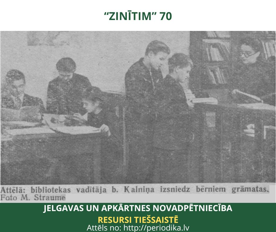 “Pa to laiku bērnu balsis bibliotēkā kļuvušas pavisam skaļas. Kā bites viņi lodā pa bagāto plauktu rindām un meklē katrs sev labāko, skaistāko, mīļāko grāmatu. Viņi ir saimnieki lielajā grāmatu valstībā. Un ir viegli tādiem būt, ja aiz muguras jūt atsaucīgas sirdis, draudzīgas un palīdzīgas rokas. Un Jelgavas bērnu bibliotēkas mazajam darbinieku kolektīvam tādas ir.” https://ej.uz/us8d