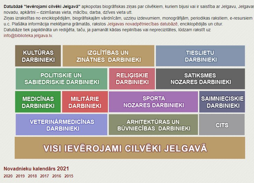 Savukārt kopš decembra sākuma atjaunota piekļuve Jelgavas pilsētas bibliotēkas veidotajai datubāzei Ievērojami cilvēki Jelgavā, kura 2020. gadā nebija publiski pieejama sakarā ar tehnisku uzlabojumu veikšanu un nepieciešamību rediģēt datus. Datubāze šobrīd atkal pieejama ikvienam interesantam, taču darbs pie datu rediģēšanas un papildināšanas joprojām turpinās, tāpēc aicinām ikvienu: ja pamanāt nepilnības vai neprecizitātes, vai arī Jums ir ierosinājumi, ar kādām personām datubāze būtu papildināma – lūdzu sazinieties ar mums info@biblioteka.jelgava.lv.
