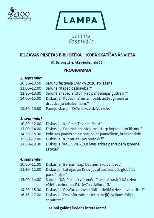 No 02.09. līdz 04.09. Jelgavas pilsētas bibliotēkas Krišjāņa Barona zālē ikvienam interesentam būs iespēja piedalīties tiešsaistes sarunu festivālā "Lampa".
