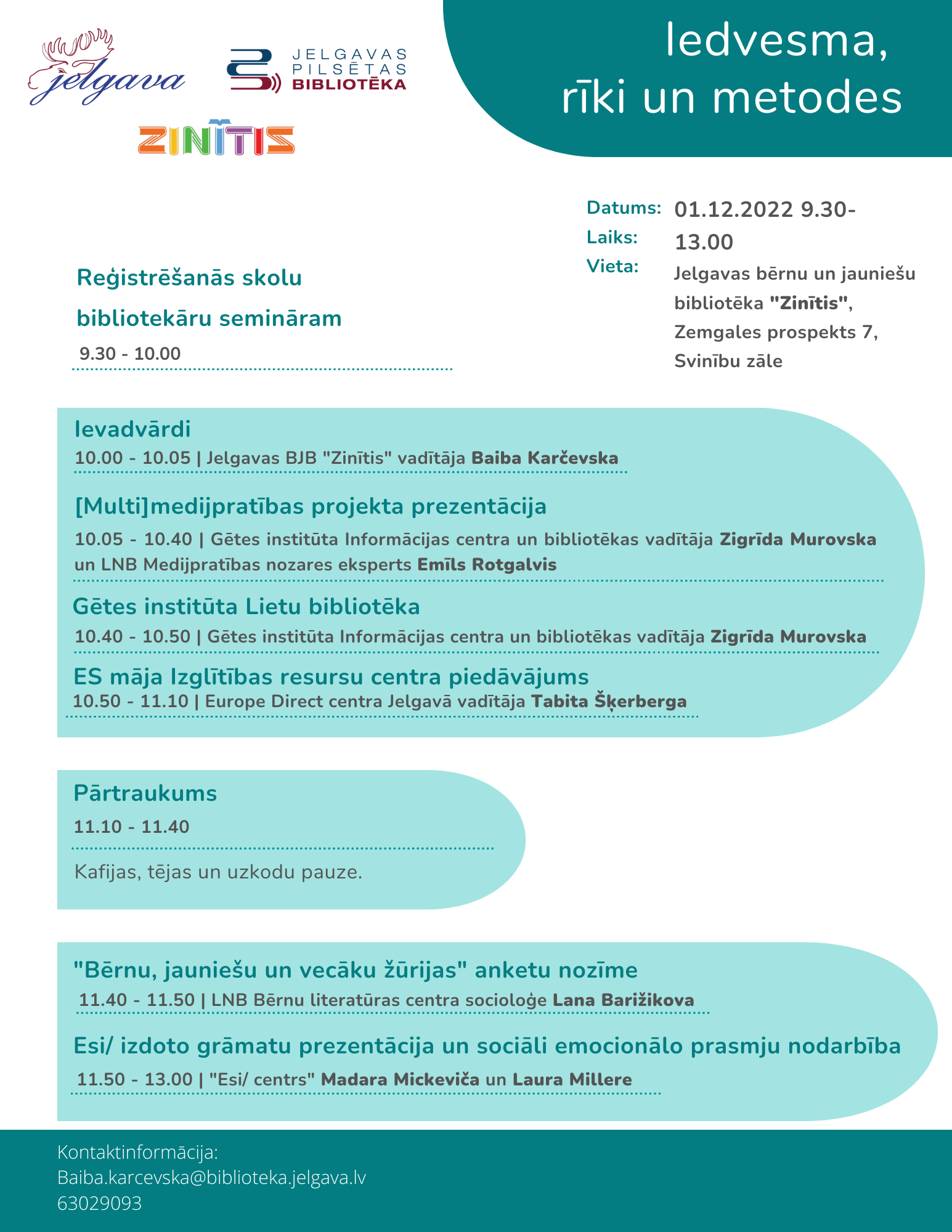 1.decembrī Jelgavas bērnu un jauniešu bibliotēkā "Zinītis" Zemgales prospektā 7 skolu bibliotekāriem tiek rīkots seminārs "Iedvesma, rīki un metodes". Semināra mērķis ir rosināt un iedvesmot skolu bibliotekārus darbam ar bērniem un jauniešiem, piedāvājot iedvesmas stāstus, rīkus un metodes, kas dažādos pasākumu un nodarbību saturu. Vietu skaits seminārā ir ierobežots.