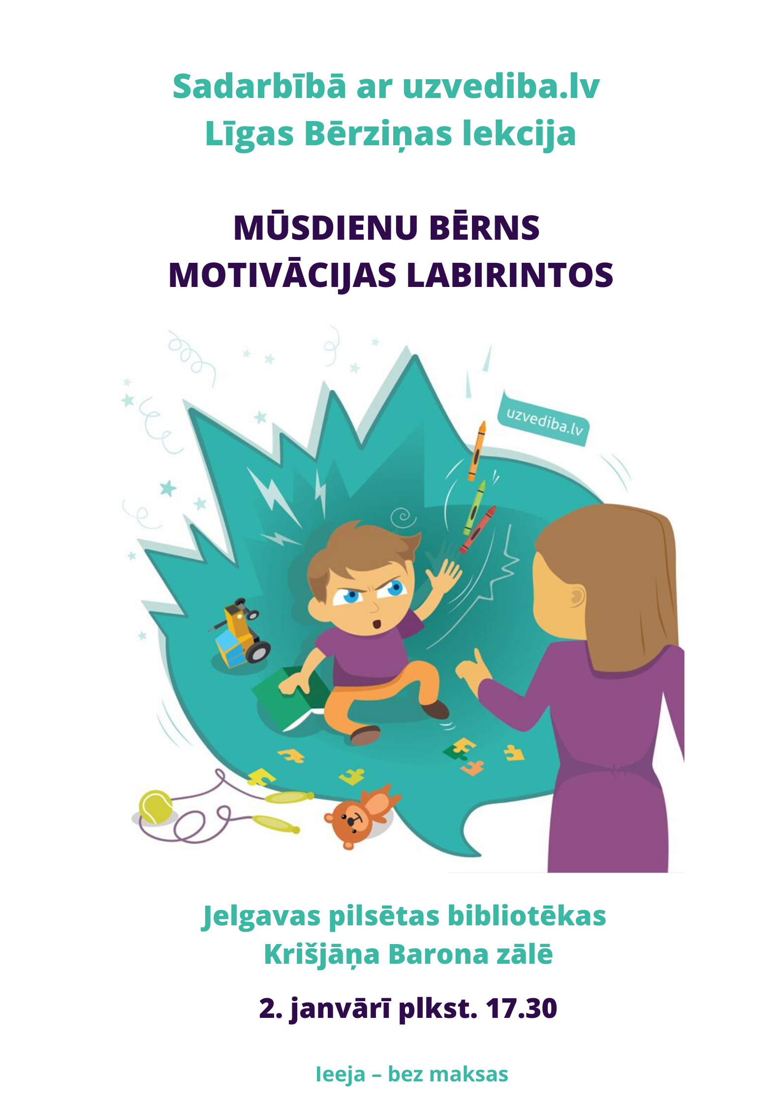 2. janvārī plkst. 17.30 Jelgavas pilsētas bibliotēkas Krišjāņa Barona zālē notiks bezmaksas seminārs vecākiem "Mūsdienu bērni motivācijas labirintos", ko sadarbībā ar Uzvediba.lv vadīs Līga Bērziņa.Seminārā būs iespēja pārrunāt dažādus ar bērnu audzināšanu saistītus jautājumus, ar ko saskaras ikviens vecāks.