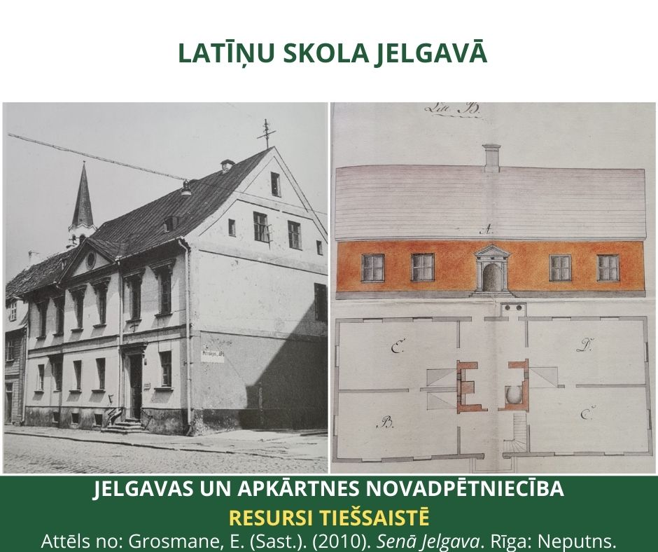 Vēstures avoti ziņo, ka 1567. gadā pie Sv. Trīsvienības baznīcas Jelgavā dibināta Lielā jeb Latīņu skola (Grosse lateinische Schule in Mitau), vēlāk – lielā pilsētas skola (Die große Mitauische Stadtschule). Īpašu skolas namu Jelgavā uzceļ 1577. gadā.