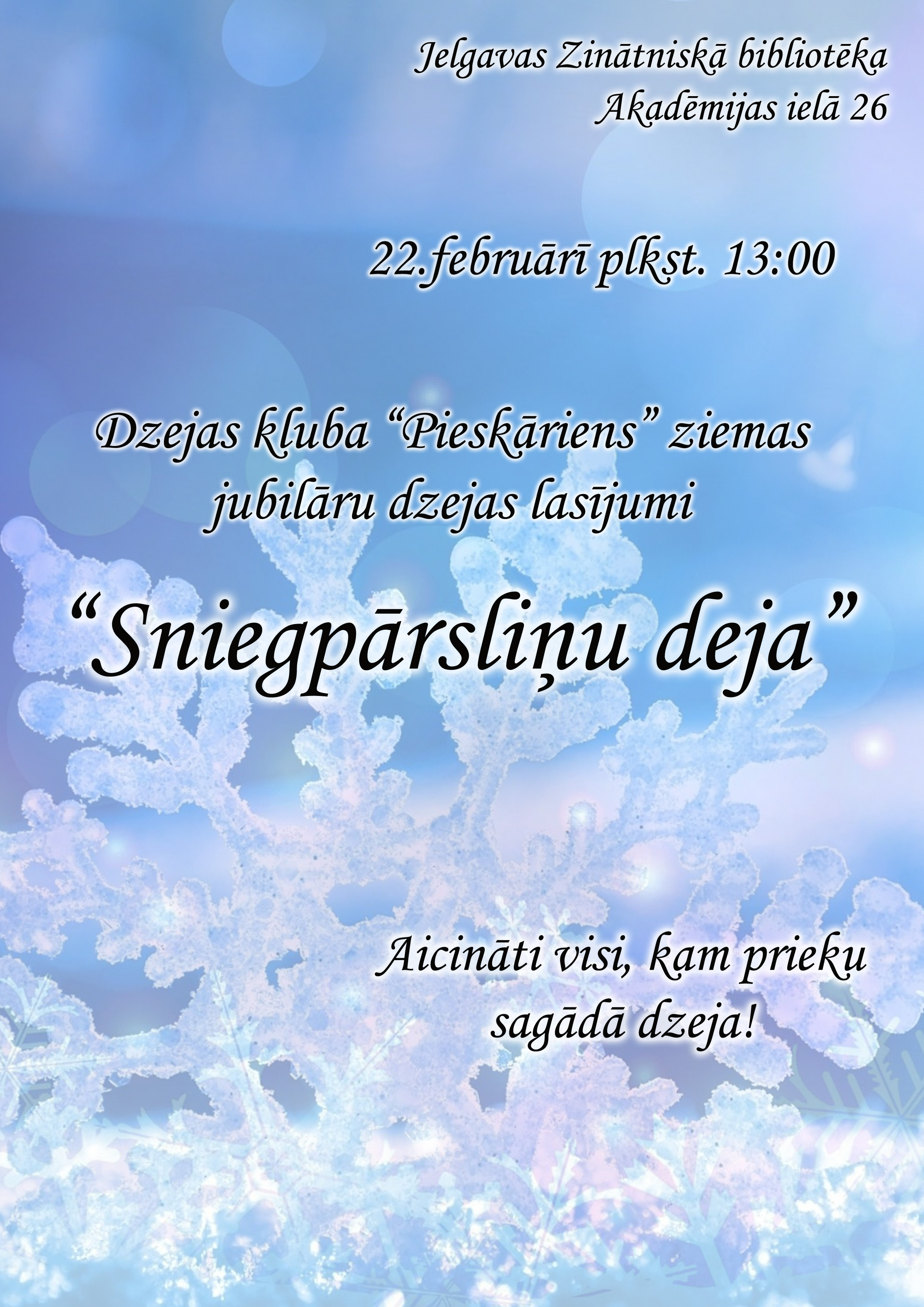 22.februārī pulksten 13:00 Jelgavas Zinātniskajā bibliotēkā notiks dzejas kluba "Pieskāriens" ziemas jubilāru dzejas lasījumi "Sniegpārsliņu deja". Uz pasākumu aicināts ikviens dzejnieks, dzejas mīļotājs, draugi un tuvākie, kā arī visi tie, kam dzeja sagādā prieku! Pasākums notiek bez maksas.Jubilāri: Austra Ālmane, Mairita Ķērpe-Dūze, Signe Gaugere, Sarmīte Gausiņa-Elksne, Vija Čerņaka, Jānis Rapša, Baiba Paulīte, Kristīne Ostrovska, Vija Samoviča, Aigars Urtāns.
