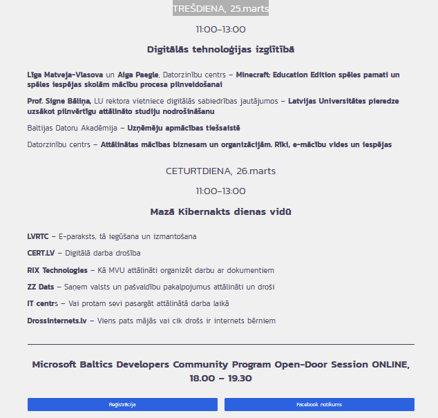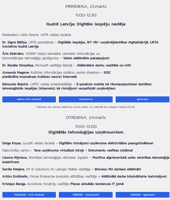 Ņemot vērā valstī izsludināto ārkārtējās situācijas stāvokli ar mērķi ierobežot Covid-19 izplatību, Digitālā Nedēļa 2020 tiek organizēta tiešraižu formā. Tiešraides būs pieejamas LIKTA Facebook kontā, straume.lv un mājas lapā www.eprasmes.lv.
