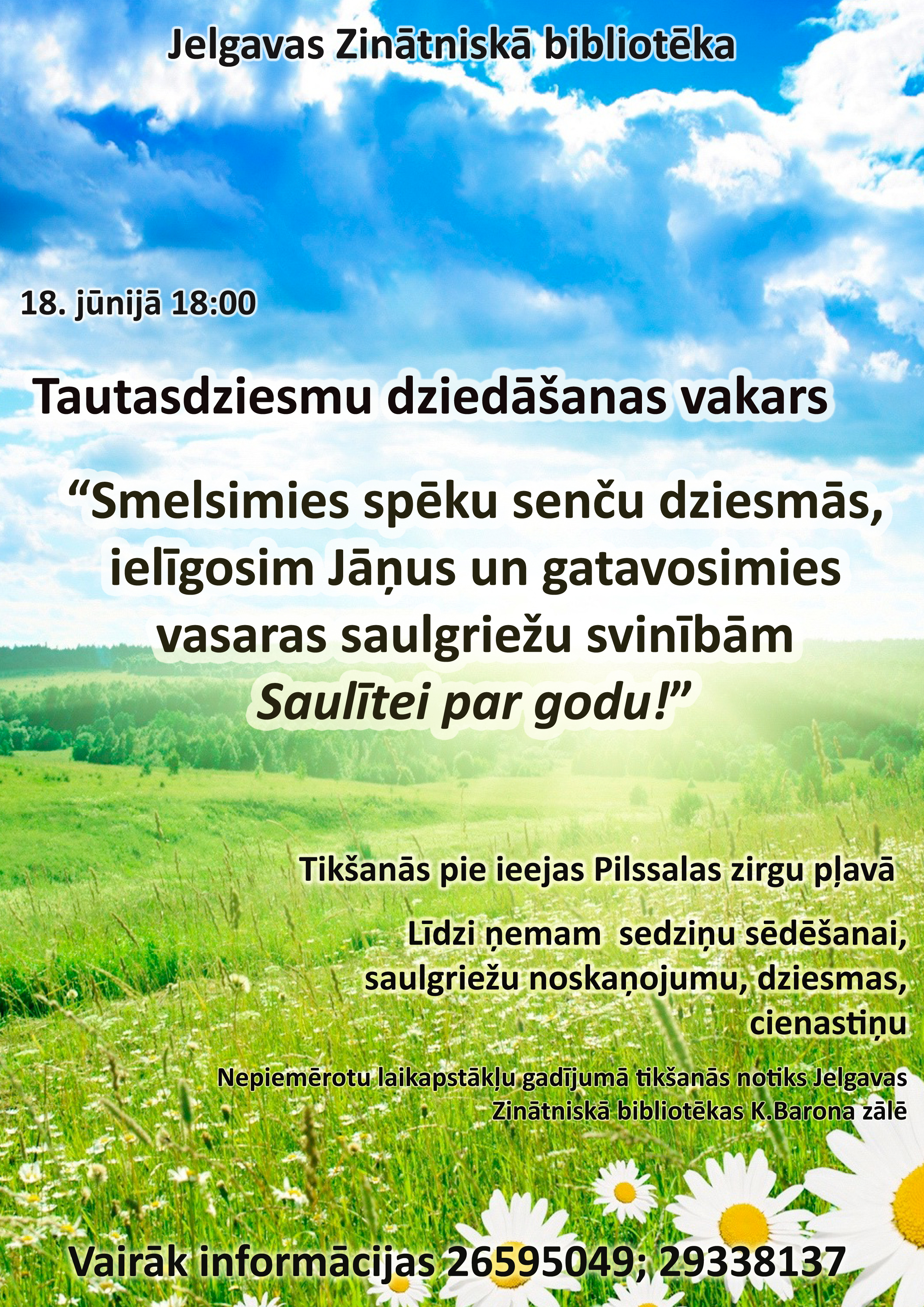 Jāņi ir vasaras svinamais laiks – vasaras saulgrieži. 18.jūnijā 18:00 smelsimies spēku senču dziesmās, ielīgosim Jāņus un gatavosimies vasaras saulgriežu svinībām Saulītei par godu! Tautasdziesmu dziedāšanas vakars notiks Jelgavas Zinātniskās bibliotēkas K.Barona zālē.