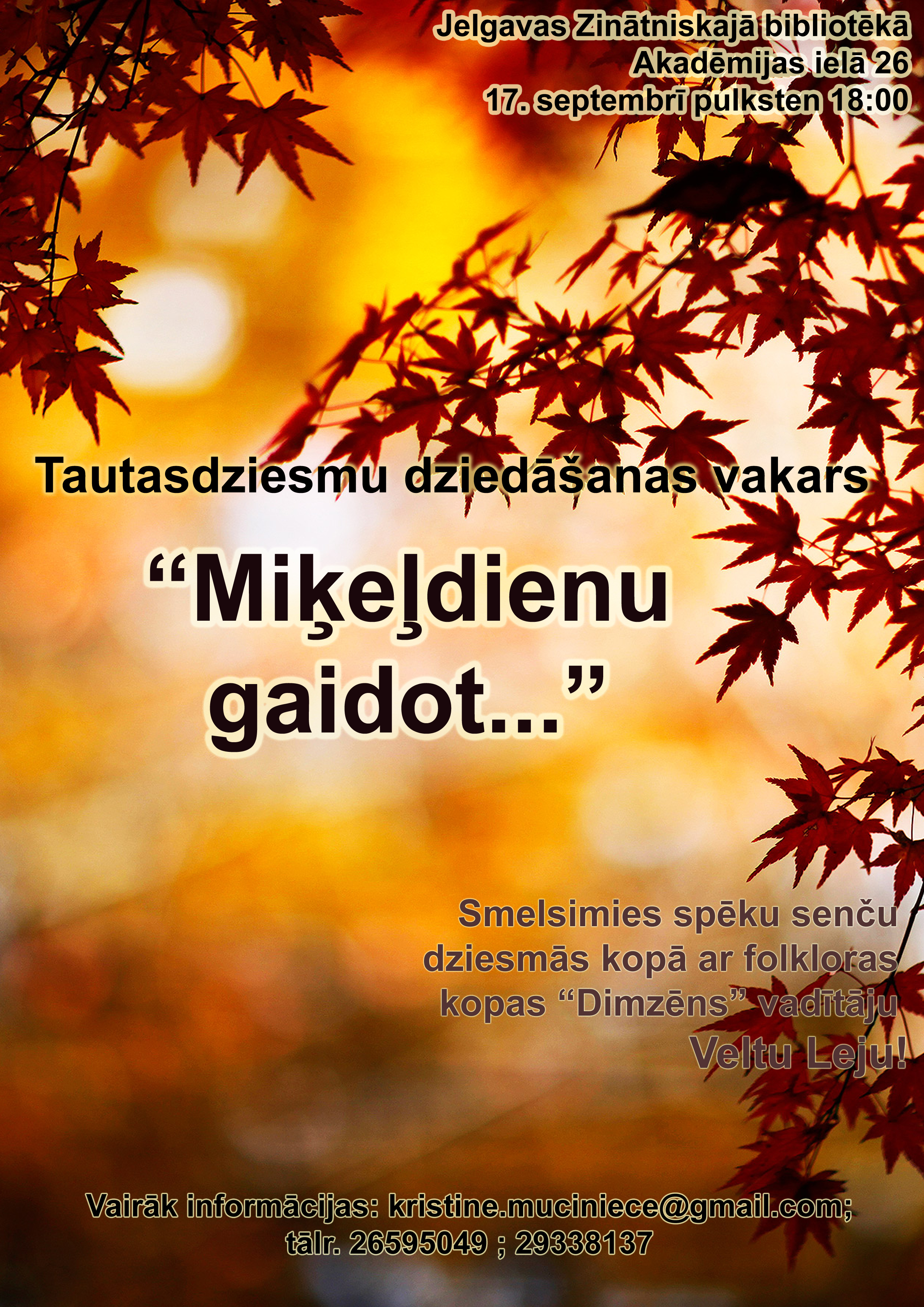 17.septembrī pulksten 18:00 Jelgavas Zinātniskā bibliotēka aicina uz tautasdziesmu dziedāšanas vakaru "Miķeļdienu gaidot...". Uz kopīgu dziedāšanu aicināts ikviens, kam patīk dziedāt, dungot un būt kopā. Par tautasdziesmu un latviskās dzīvesziņas pasākumiem šajā rudens-ziemas periodā gādās folkloras kopas "Dimzēns" vadītāja Velta Leja.Gaidot Miķeļdienu atzīmēsim arī Jumja dienu, kas ir rudens saulstāvju diena, kad, tāpat kā Lielajā Dienā, nakts un dienas garums ir vienāds. Šajā laikā ir paaugstināta enerģija un līdz šai dienai labībai jābūt novāktai. Līdz ar Jumja dienu sākas veļu laiks - dievaines, un notiek arī veļu mielasti.