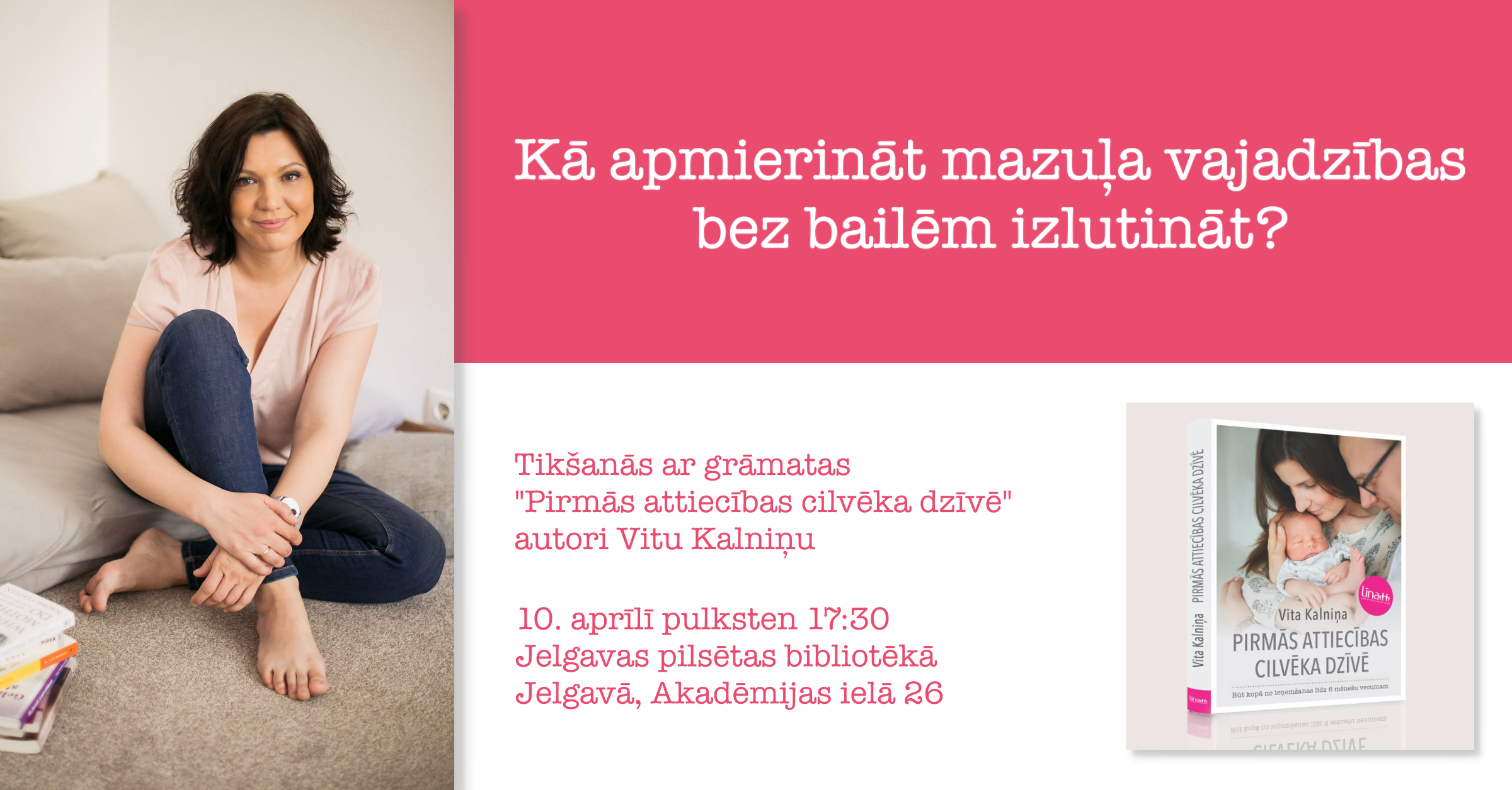 10. aprīlī pulksten 17:30 Vita Kalniņa aicina grāmatas lasītājus un citus interesentus uz tikšanos Jelgavā, Jelgavas pilsētas bibliotēkā, Akadēmijas ielā 26. Tikšanās laikā Vita stāstīs par vienām no vecāku (un arī citu bērna aprūpē iesaistīto personu) populārākajām bailēm - ka bērns varētu tikt izlutināts. Cik pamatoti ir par to satraukties un kā rūpēties par bērniņu saskaņā ar viņa vajadzībām? Vairāk par grāmatu un tās autori var uzzināt www.vitakalnina.lv vai www.lina.lv.