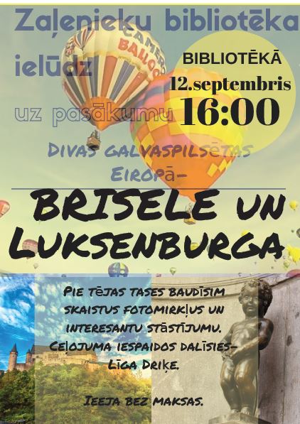 Zaļenieku bibliotēka jauno darba sezonu sāk ar vairākiem pasākumiem priekš saviem lasītājiem. Uz tikšanos ar Līgu Driķi pie tējas tases, lai baudītu skaistus fotomirkļus un interesantu stāstījumu par Briseli un Luksemburgu, Zaļenieku bibliotēkā lasītāji aicināti 12.septembrī pulksten 16:00. 14.septembrī pulksten 16:00 Zaļenieku kultūras namā laipni lūgts ikviens interesents uz dzejas dienu pasākumu kopā ar Ingūnu Lipsku "Pie manis atnāca mīlestība".