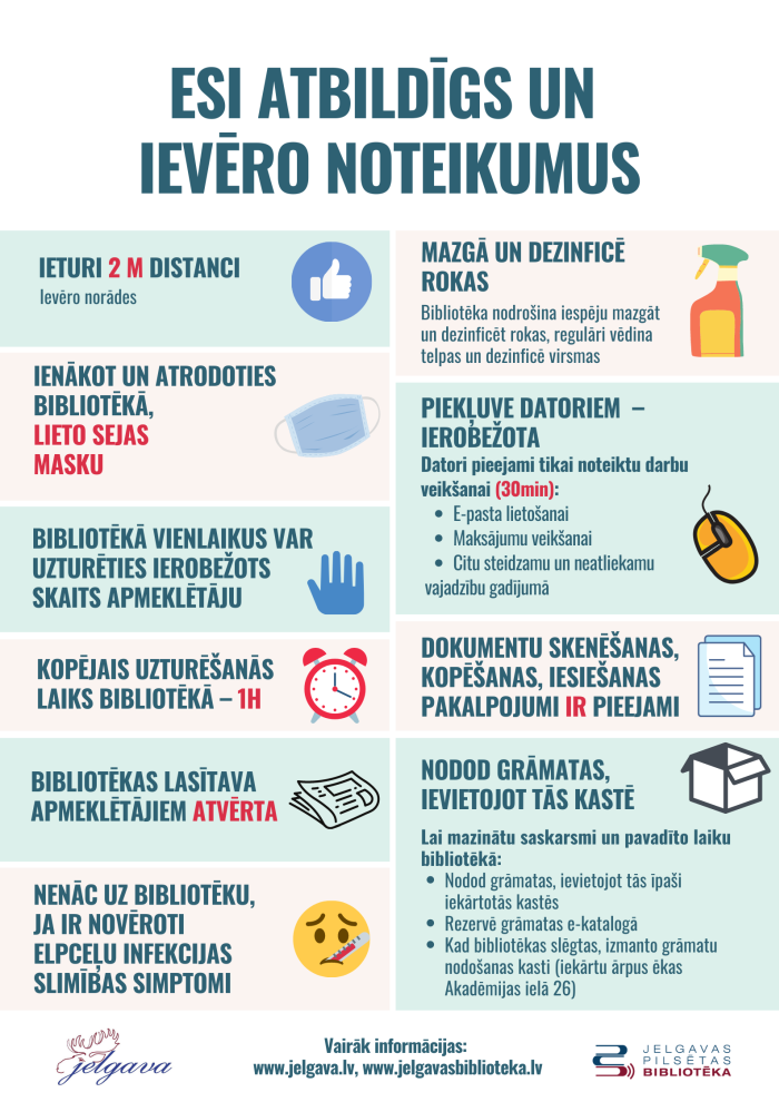 Šodien, 3. jūnijā, ar prieku savas durvis veram individuālam lasītavas un informācijas centru apmeklējumam Jelgavas pilsētas bibliotēkā un tās filiālēs Miezītes bibliotēkā, Pārlielupes bibliotēkā un bērnu un jauniešu bibliotēkā "Zinītis".