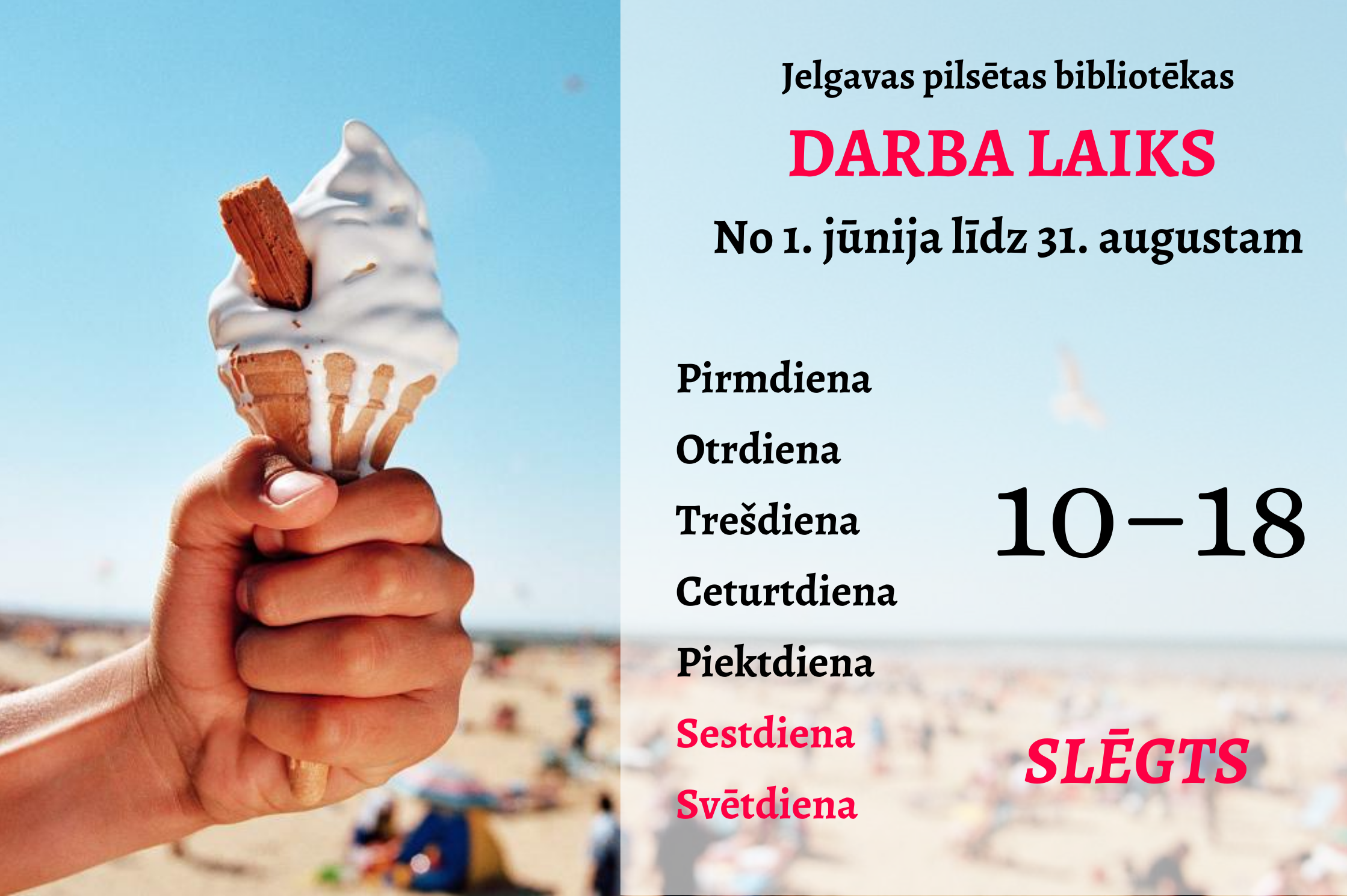 Jelgavas pilsētas bibliotēka no 1. jūnija līdz 31. augustam strādā vasaras darba laika režīmā. Bibliotēka atvērta apmeklētājiem katru darba dienu no plkst. 10–18. Sestdien, svētdien – slēgta.