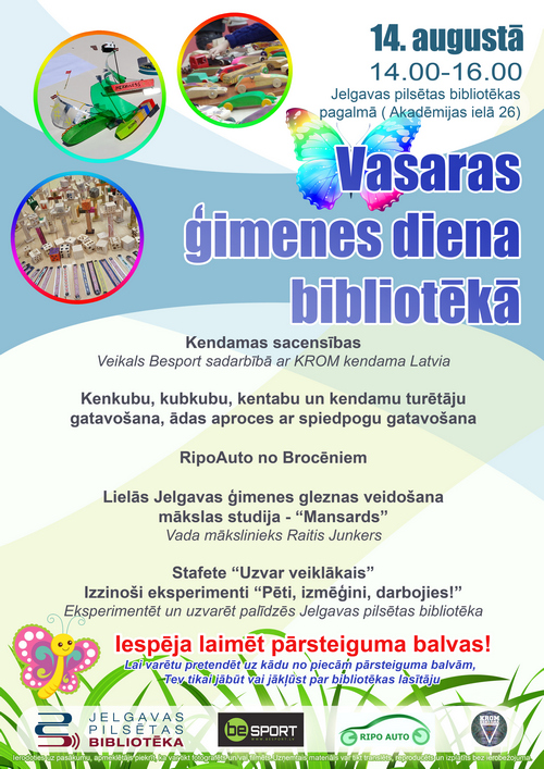 Jelgavas pilsētas bibliotēka aicina uz VASARAS ĢIMENES DIENU BIBLIOTĒKĀ 14. augustā no pulksten 14.00 līdz 16.00. Bibliotēkas pagalmā būs iespējams piedalīties radošajās darbnīcās, kurās veidosim kenkubus, kendamu turētājus un spiedpogas, tās nodrošinās RipoAuto no Brocēniem. Aicinām savu izveicību pārbaudīt stafetē “Uzvar veiklākais”, kā arī pavadīt laiku, aizraujoši eksperimentējot. Daudzus apmeklētājus vilinās kendamas sacensības, ko piedāvā veikals Besport sadarbībā ar KROM kendama Latvia. Jaunums vasaras ģimenes dienā būs lielās Jelgavas ģimenes gleznas veidošana sadarbībā ar mākslinieku Raiti Junkeru. Gaidīsim ikvienu interesentu!