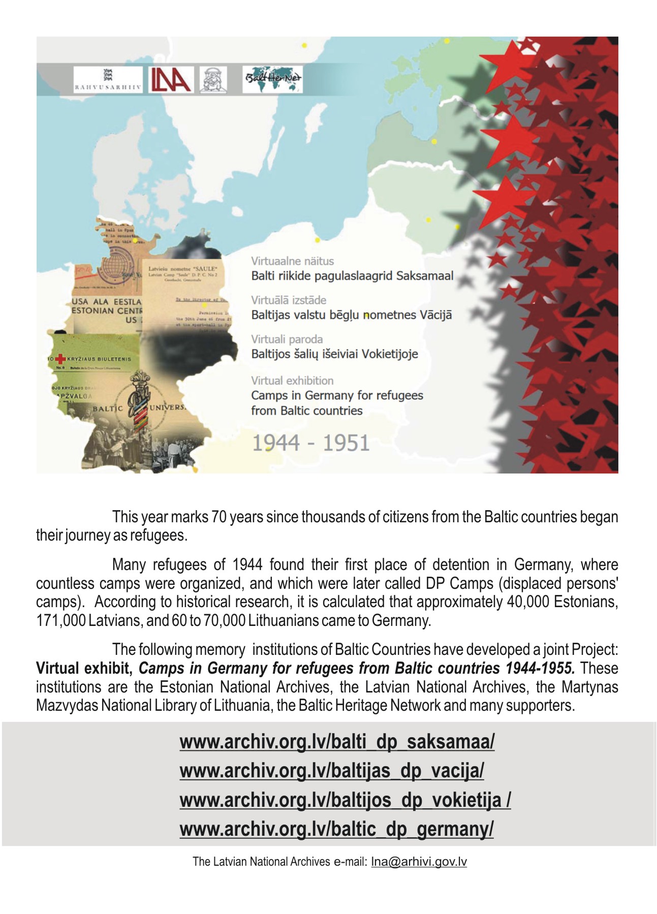 Šogad aprit 70 gadi kopš bēgļu gaitās devās tūkstošiem Baltijas valstu iedzīvotāju, tādēļ Baltijas valstu atmiņu institūcijas: Igaunijas Nacionālais arhīvs, Martina Mežvīda Lietuvas Nacionalā bibliotēka, "Baltijas mantojuma tīkls" (Baltic Heritage Network) Latvijas Nacionālā arhīva vadībā un kopā ar atbalstītājiem ir izveidojuši virtuālo izstādi "Baltijas valstu bēgļu nometnes Vācijā. 1944–1951". Lielākā daļa no viņiem savu dzimteni pameta uz visiem laikiem. 1944. gada 10.oktobrī Rīgas ostu atstāja pēdējais kuģis ar evakuētajām personām.